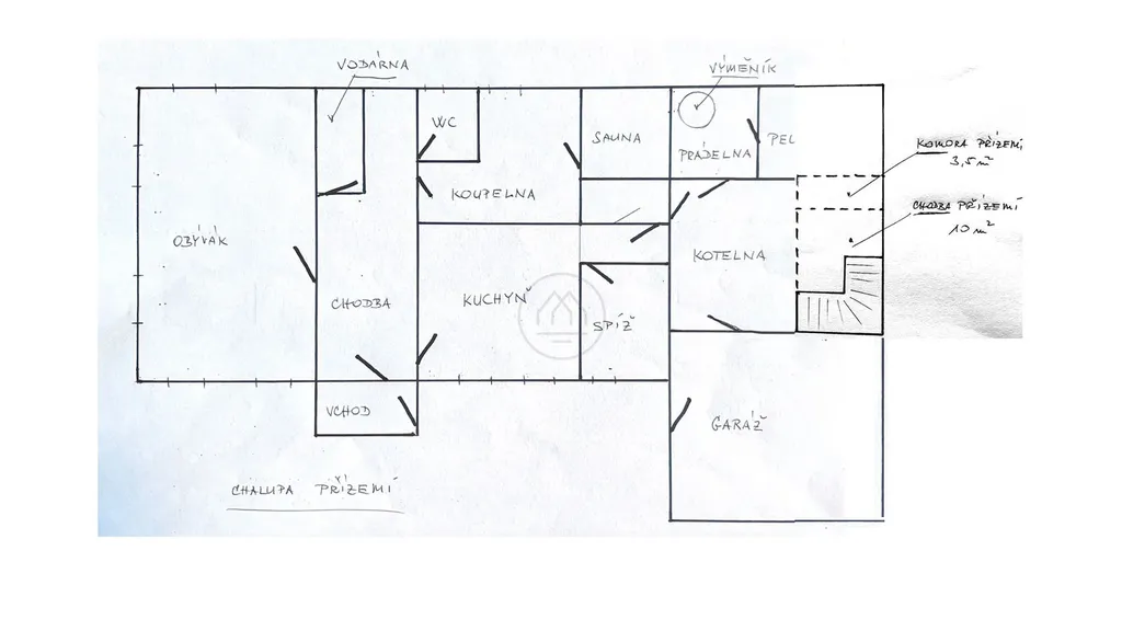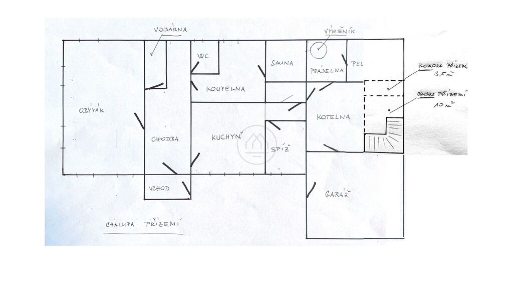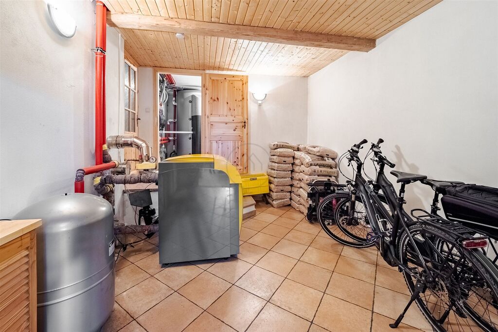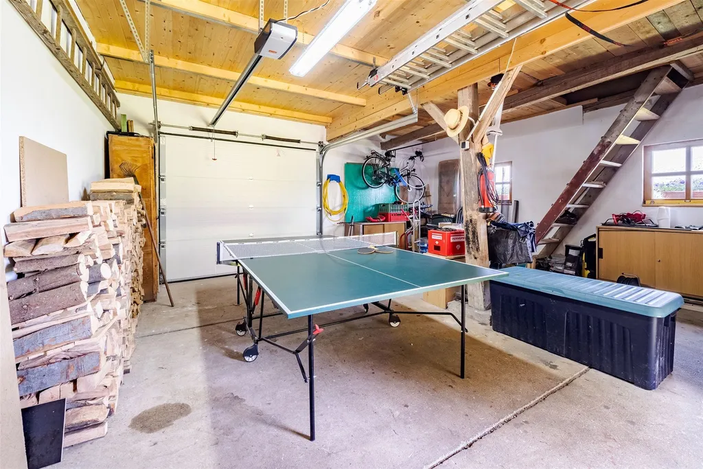 Přízemí domu také zahrnuje prádelnu, kotelnu, sklad a prostornou garáž s dílnou. Vytápění a ohřev vody zajišťuje moderní kotel s automatickým přísunem pelet ze zásobníku na 8 tun. Dále je možné alternativní vytápění dřevem v kamnech. Na pozemku je také vrt na vodu a kopaná studna. Kanalizace je řešena 3komorovým betonovým septikem o kapacitě 10m3.