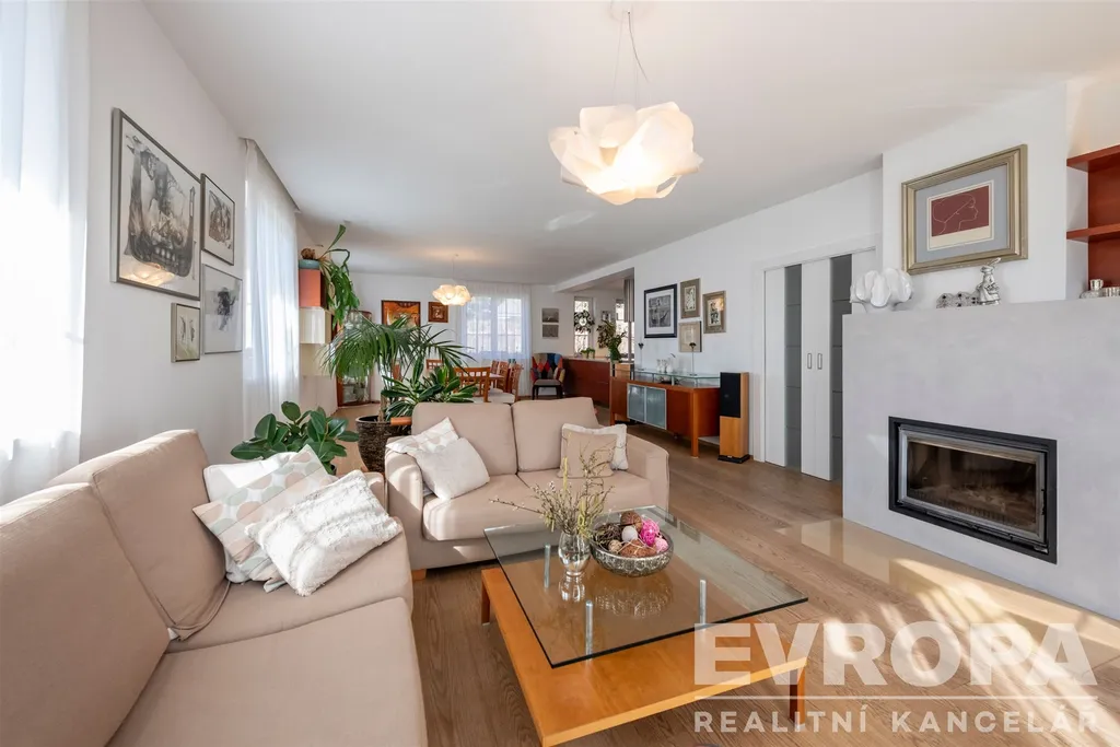 • Velkorysý obývací pokoj s krbem a přímým vstupem na krytou terasu (30 m²) – ideální pro letní snídaně i večerní víno