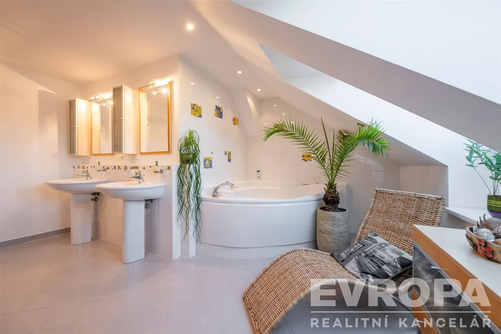 Patro: tři pokoje (jeden velmi prostorný), šatna, samostatné WC a velká koupelna s vanou a prostorem pro domácí fitness.