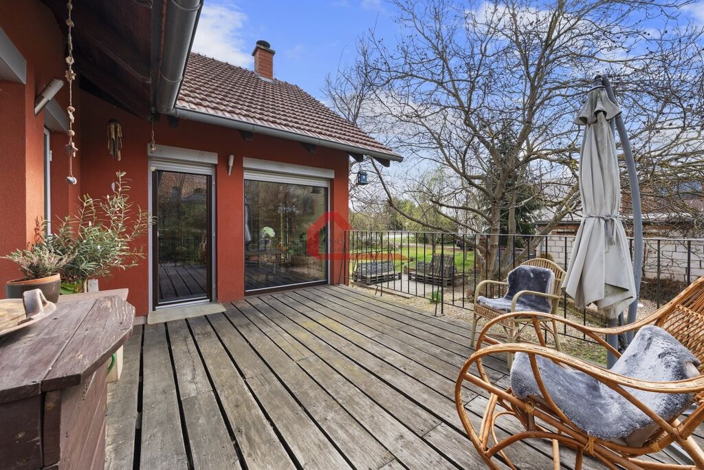 Patrový dům byl postaven jako dřevostavba v roce 2009 a nachází se na rohovém pozemku, dostupném i ze zahrady o celkové výměře 813 m2. K domu náleží terasu o velikosti 20 m2 přístupná jak z obývacího pokoje tak i z ložnice, ideální pro relaxaci.