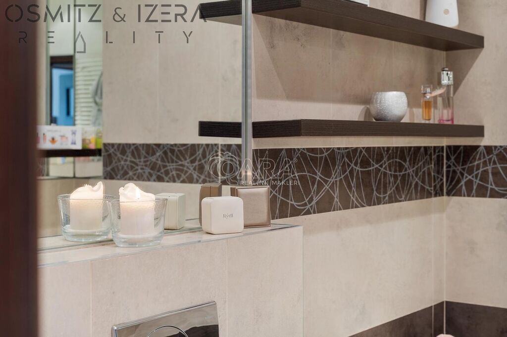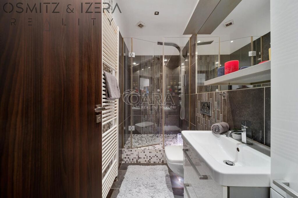 Atypicky řešená dispozice bytu 3+kk je doplněna o samostatnou šatnu. Dále je u kuchyňského koutu k dispozici komora sloužící i jako prádelna. V bytě jsou dvě prostorné koupelny. Všechny místnosti jsou přístupné ze vstupní haly. Velký, jižně orientovaný, obývací pokoj o ploše 48 m2 s prosklenou stěnou je vkusně vybaven na míru zhotoveným nábytkem. Okna obou ložnic jsou orientována na sever pro příjemné klima na spaní. Architektonické a designové řešení, povrchů stěn, podlah a sladění s atypickým nábytkem měl na starosti ateliér ZAKI Design. Byt si vyhlédli i redaktoři trendového časopisu a věnovali mu několik stran jako vzoru zdařilé luxusní rekonstrukce bytu ve starší zástavbě pražských Strašnic. K příjemnému pocitu ze vzdušného a světlého prostoru bytu přispívají také v dnešních novostavbách nedostupné vysoké stropy původního domu.