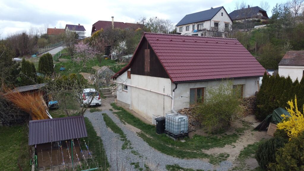 Domybyty.com Vám ve výhradním zastoupení nabízejí ke koupi menší přízemní rodinný domek na klidném místě – Zaječice. Domek se nachází na mírně svažitějším pozemku o celkové výměře 965m2 (z toho zastavěná plocha 90m2. Dispozice domu je následující dispozici: vstupní chodba, koupelna se sprchovým koutem + wc, prostorná kuchyň s menším obývací koutem, ložnice, sklad na nářadí. Vytápění zajišťuje tepelné čerpadlo (vzduch/vzduch) a v místnostech jsou umístěná krbová kamna. Sítě: voda ze studny, městská voda přivedena k nemovitosti, elektřina, odpad sveden do kanalizace, plyn přiveden pouze do HUP.