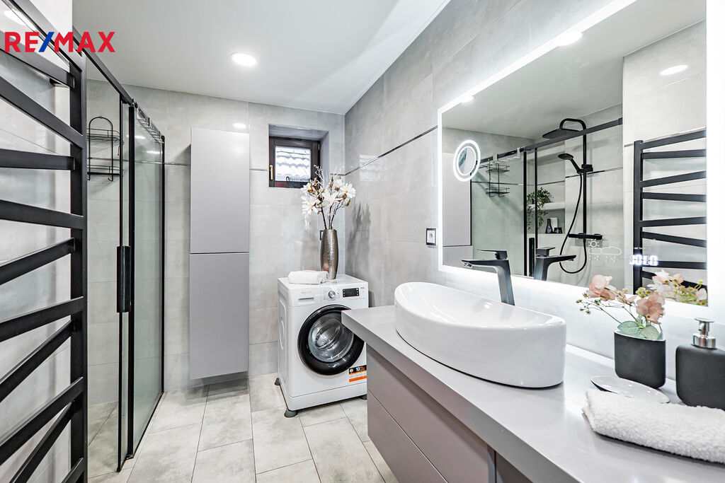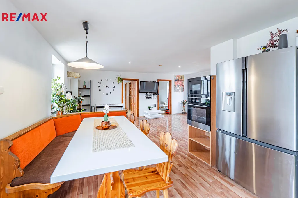 V domě se nachází dvě kuchyně, obývací pokoj, čtyři samostatné pokoje v patře včetně šatny a malé spíže u horní kuchyně. V přízemí je jeden velký pokoj (aktuálně kadeřnictví) a přes chodbu další samostatný pokoj (bývalé kadeřnictví). Součástí domu je také zastřešená veranda (balkon), dvě koupelny (jedna v přízemí s oddělenou šatnou), pět toalet, garáž, malý sklep ve starší části domu s tlakovou nádobou na studnu, skladový prostor vedle garáže na zahradní nábytek a podzemní kamenný sklep s klenutými stropy ideální pro uskladnění zeleniny. Dispozice tedy umožňuje pohodlné vícegenerační soužití i oddělené provozy, případně kombinaci bydlení a podnikání.