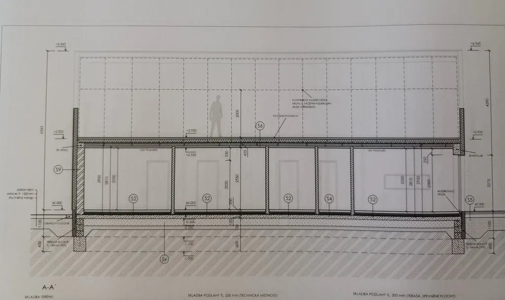 Dispozice: vstupní předsíň(5,18m2), samostatné WC(2,35m2), tech.místnost(6,58m2), koupelna s WC(8,91m2), obývací pokoj s kuch.koutem (33m2), spíž (3,23m2), chodba (11m2), 3 ložnice (13,15m2, 9,25m2, 8,8m2), šatna (4,72m2)+úložný prostor na půdě.