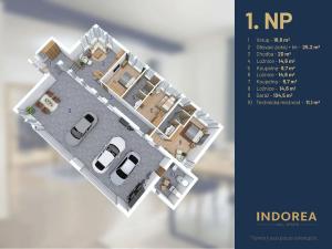 Ve druhé části pak obývací pokoj s kuchyňským koutem, dvě koupelny, tři ložnice a garáž pro šest vozidel.