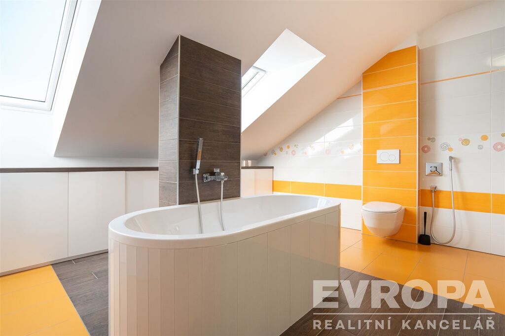 Z obývacího pokoje s jídelní částí v přízemí (místnost cca 70m2) vstupujete přímo do zahrady nebo do wellness zóny (vnitřní bazén, třetí wc, sprcha, fitness, sauna). V patře domu je samostatný vstup do 3 místností, šatny a koupelny se čtvrtým wc.