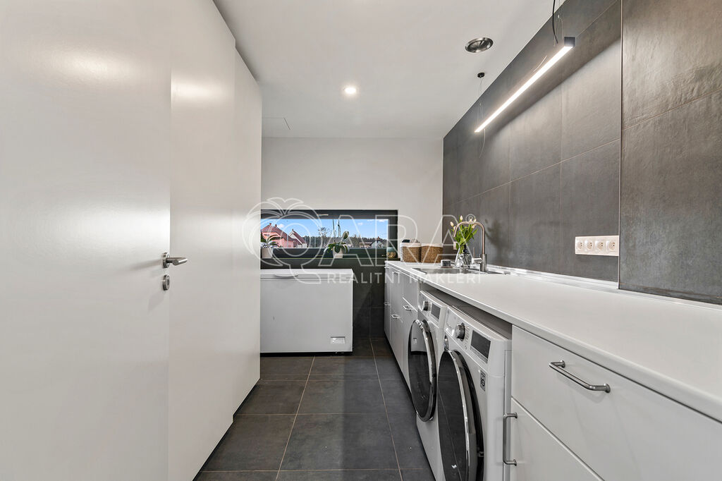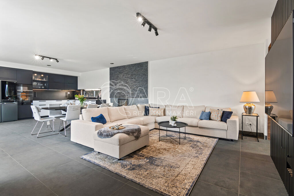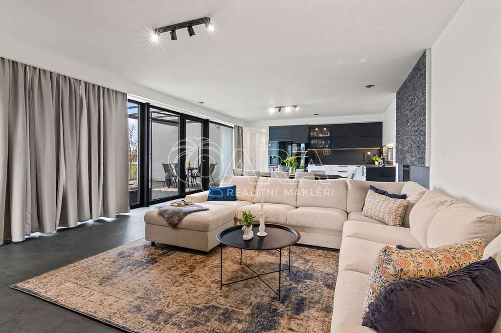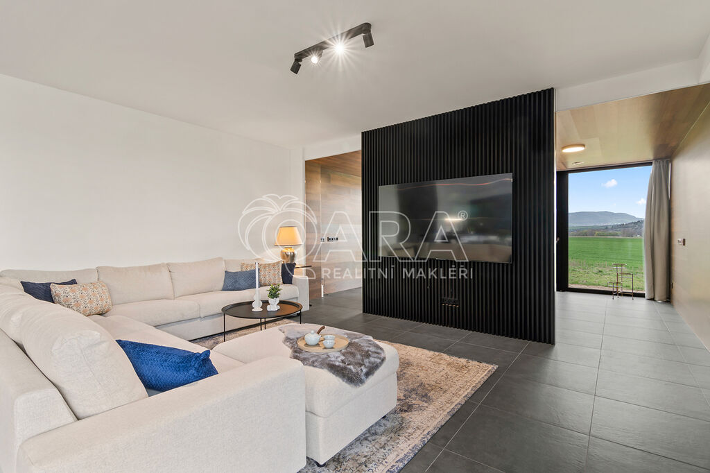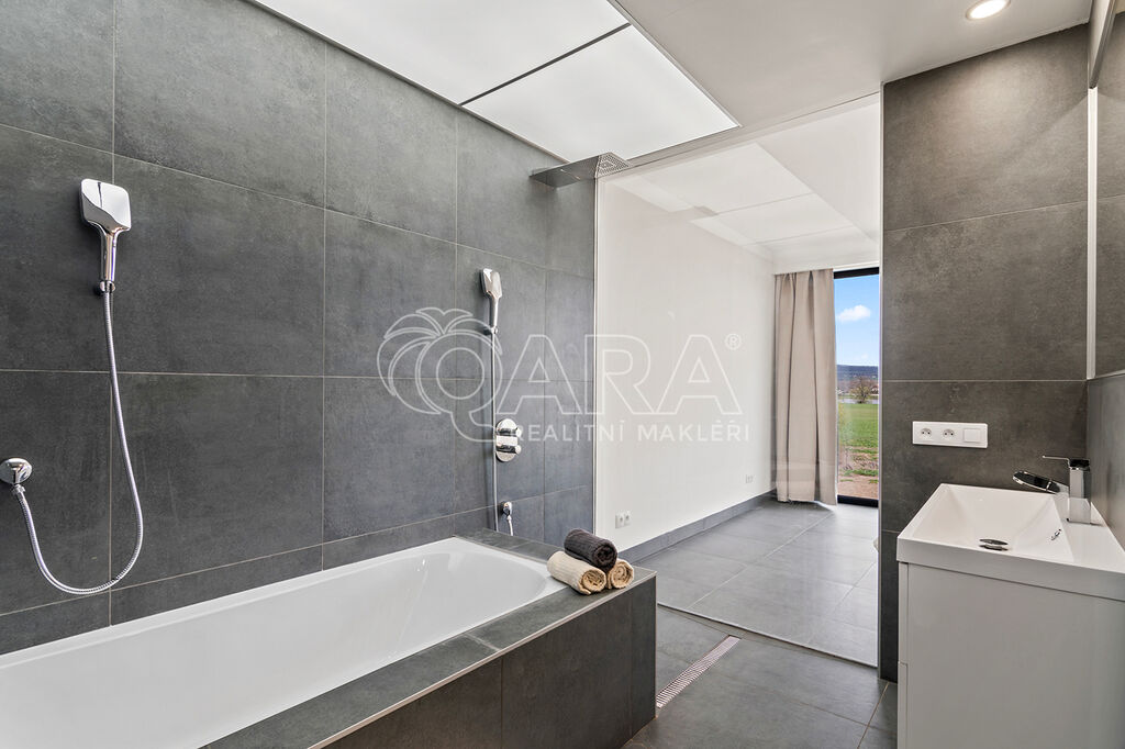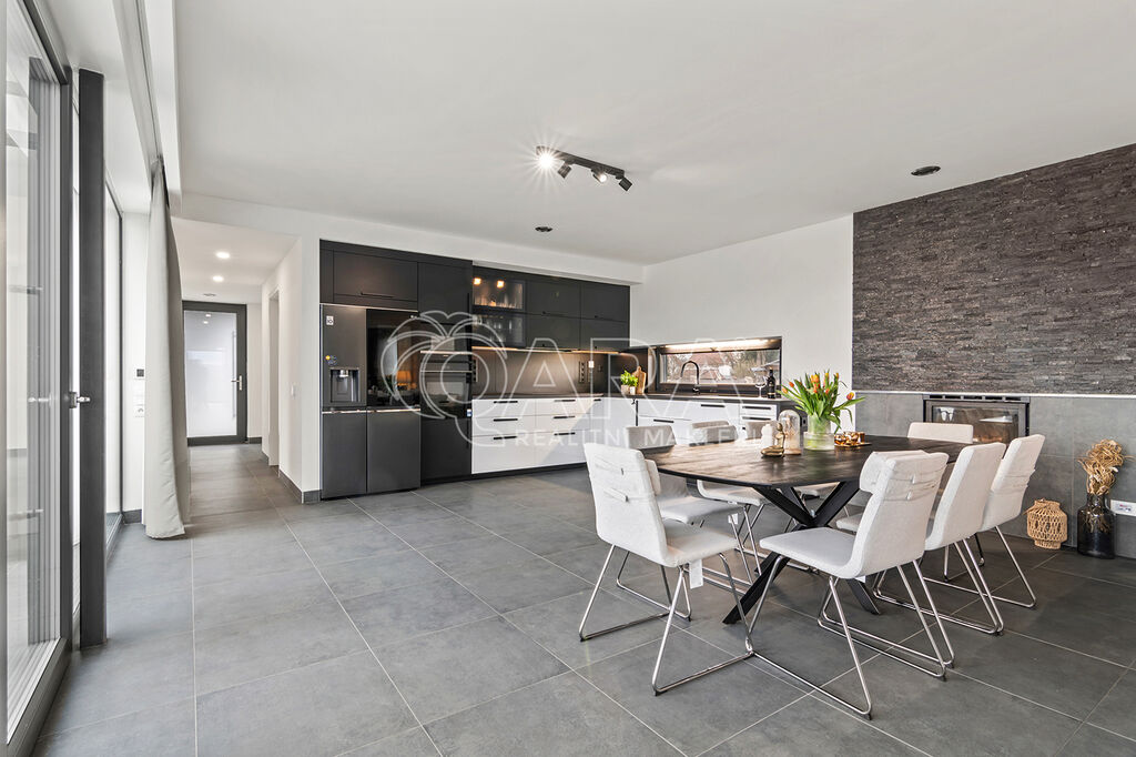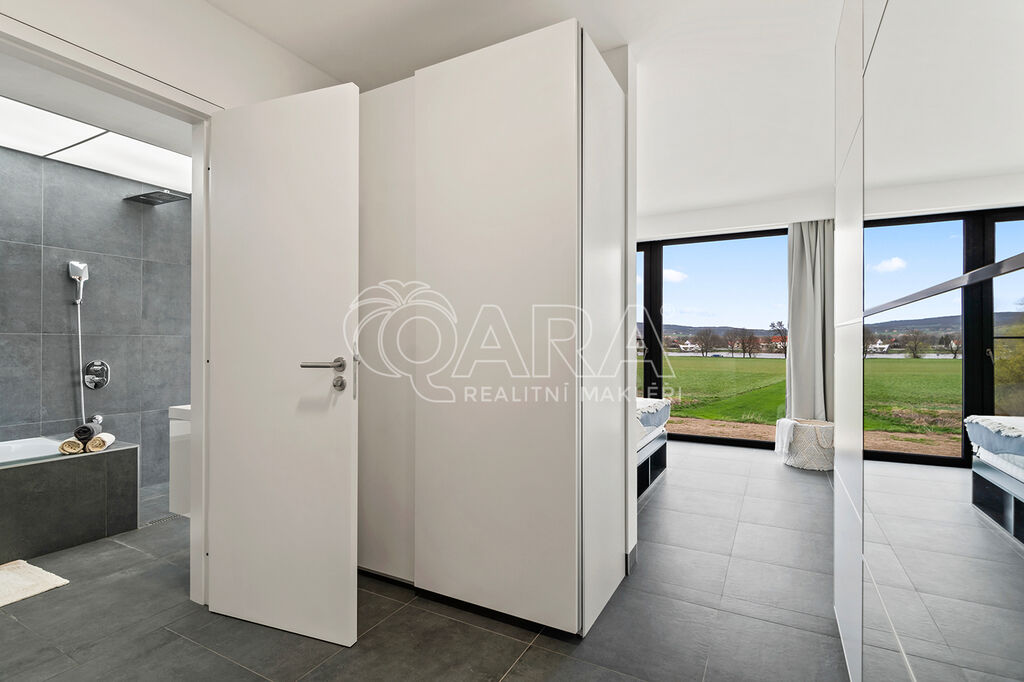 Tento dům je postavený s myšlenkou na dlouhá desetiletí, bez kompromisů a bez honby za módními výstřelky, které rychle zastarají. Interiéru dominují přírodní a poctivé materiály. Podlahy pokrývá velkoformátová dlažba, která není jen krásná na pohled, ale i mimořádně odolná vůči opotřebení. Stěny jsou vkusně doplněny dřevěnými obklady, které prostoru dodávají teplo a přirozenou eleganci. Barevné ladění v kombinaci bílé a antracitové působí nadčasově a čistě a umožní budoucímu majiteli jednoduše doladit interiér podle vlastního stylu.