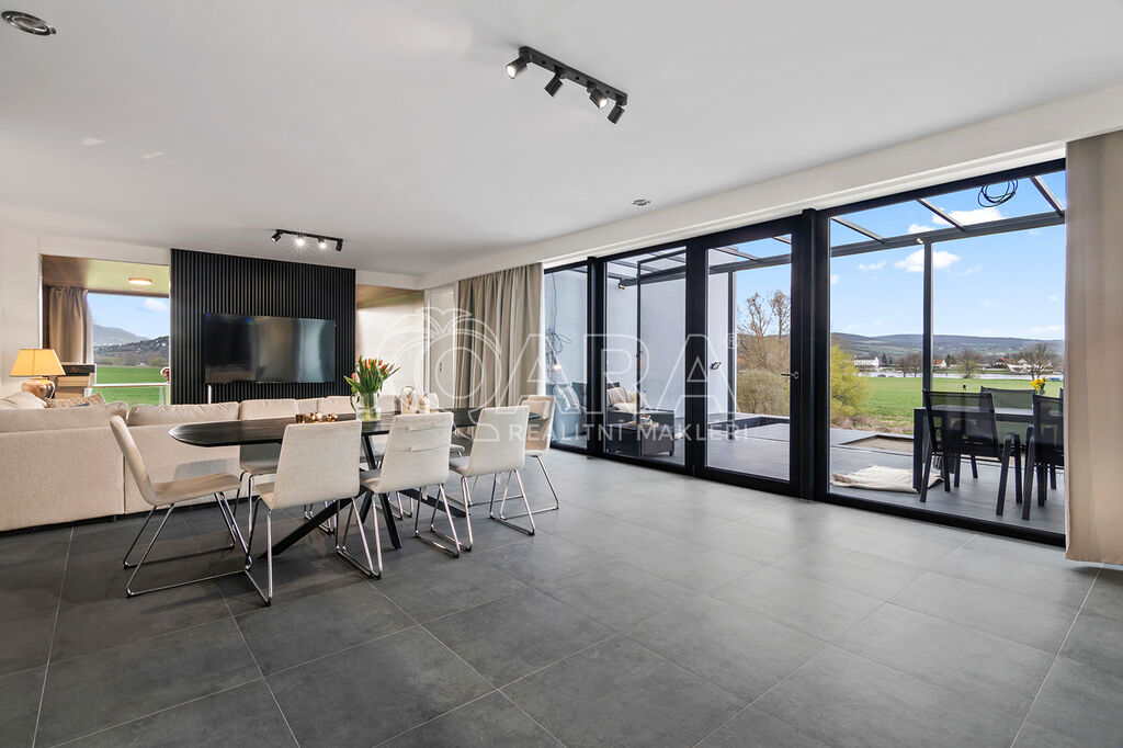 Dům má dispozici 5+kk a užitnou plochu 149 m². Celková podlahová plocha včetně terasy, která se Vám díky podvečerním výhledům na červánky nad Labem jen tak neomrzí, a velkorysých sklepních prostor, činí 259 m2. Srdcem domu je nadčasový obývací prostor s kuchyní, odkud se přímo vstupuje na částečně krytou terasu. Kuchyně je z IKEA, vybavená spotřebiči Siemens a americkou lednicí LG. V domě jsou dvě prostorné ložnice s výhledem na řeku, dvě samostatné pracovny s výhledem na České středohoří, dvě koupelny, dvě šatny a technické zázemí. V suterénu se pak nachází téměř 80 m² skladových/sklepních prostor.