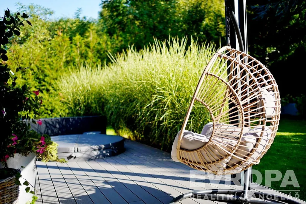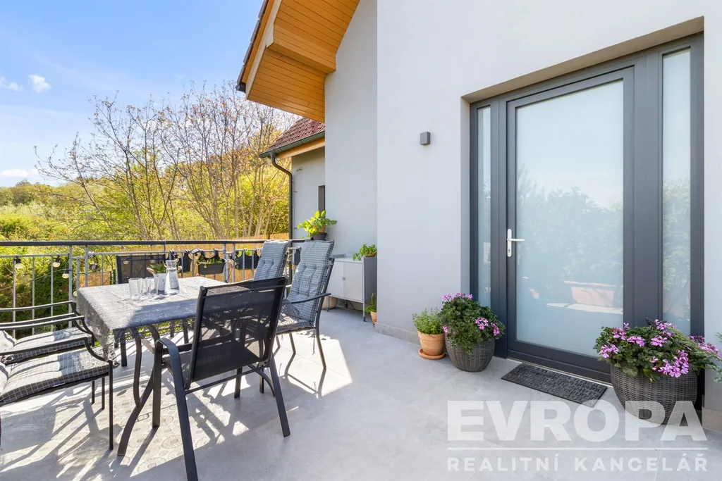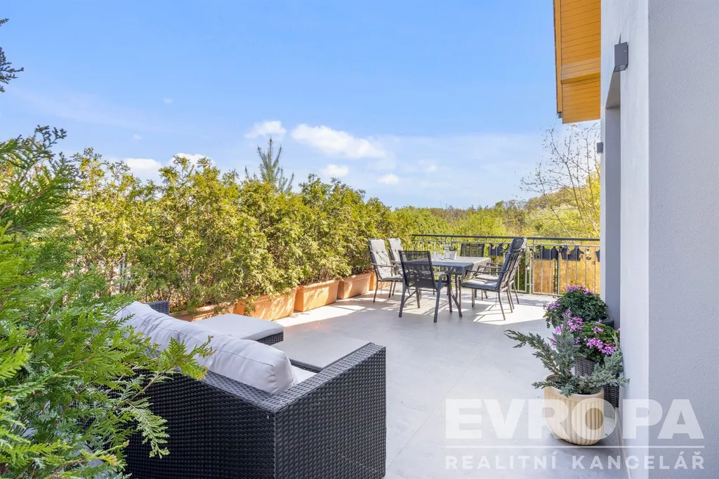 Pozemek se vzrostlými stromy, keři a okrasnou zahradou zaručuje naprosté soukromí a ničím nerušený výhled do údolí. Parkování je zajištěno v garáži a na čtyřech venkovních stáních na vlastním pozemku u domu.