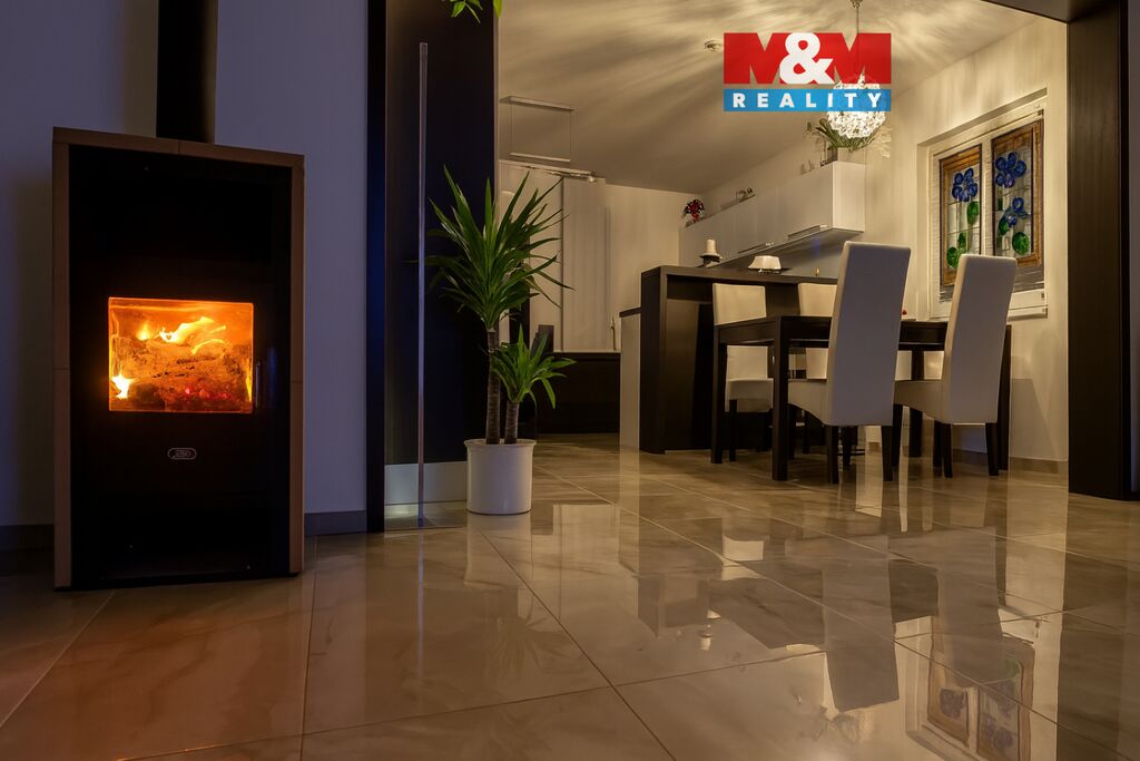 Dispozice: obývací pokoj s krbem, kuchyně na míru se značkovými spotřebiči, 3 samostatné pokoje, 2 šatny, koupelna, 2× WC, technická místnost, terasa 40 m².