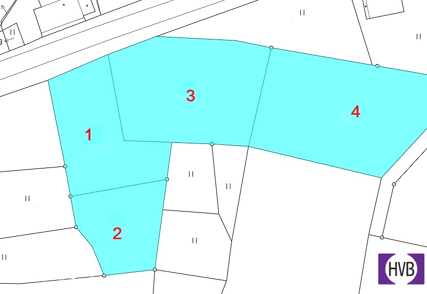 Pronájem stavebního pozemku 4241 m2, Hamrska, Velké Hamry, okres Jablonec nad Nisou. Jedná se o soubor 4 pozemků ( na plánku označené č. 1, 2, 3, 4) o celkové výměře 4241 m2.