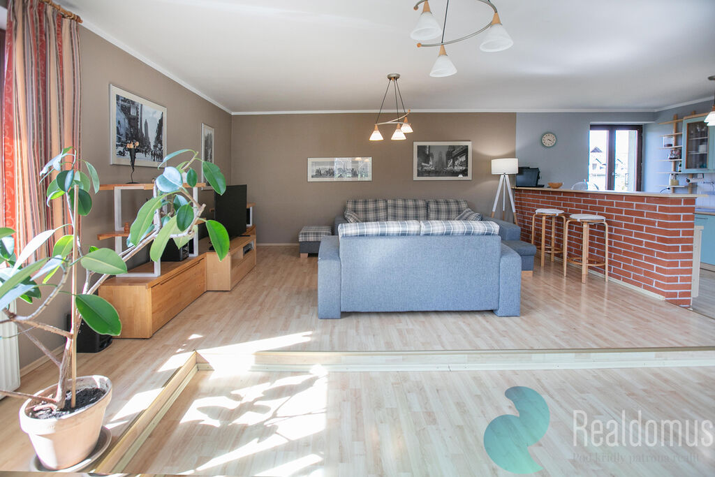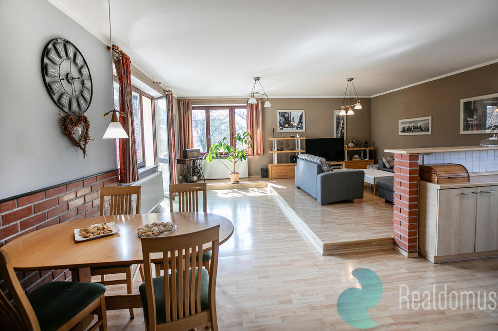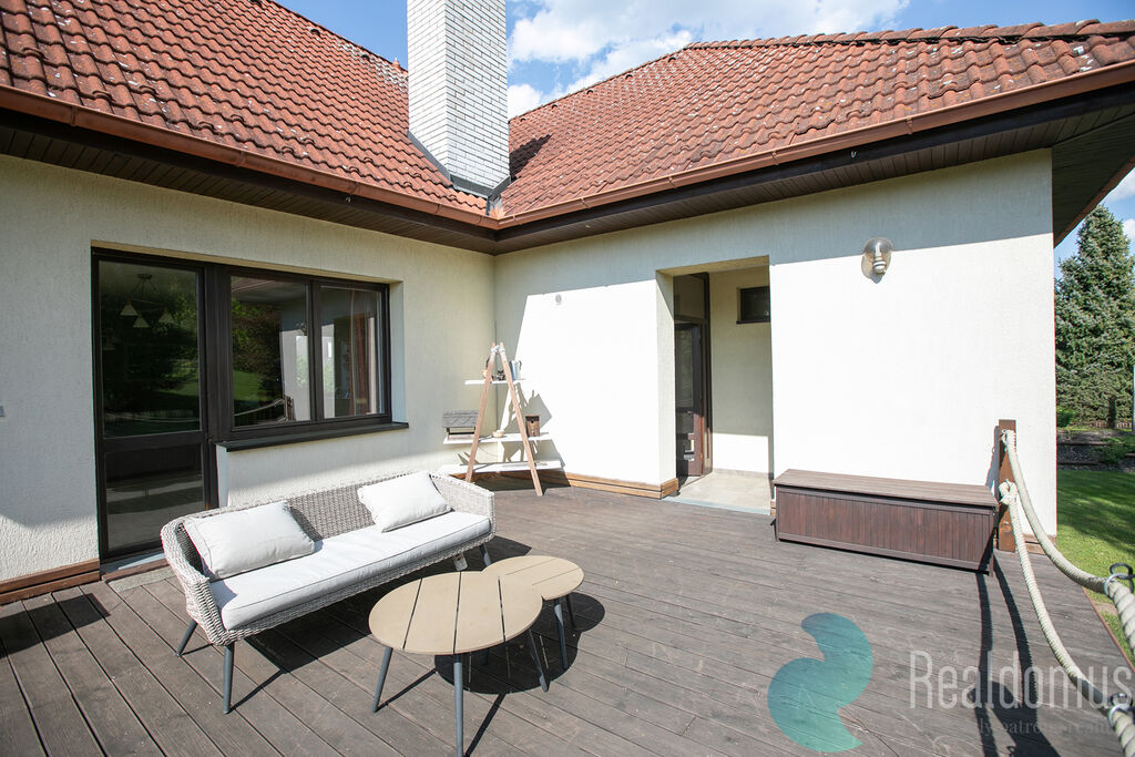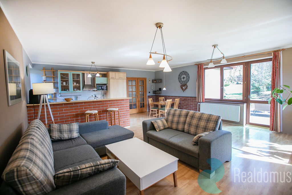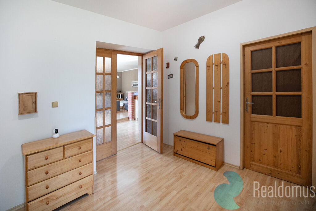 Dominantou přízemí je prostorný obývací pokoj propojený s kuchyňským koutem, odkud vede vstup na slunnou terasu – ideální místo pro ranní kávu či letní grilování. Je možné vybudovat krb, jelikož obývákem prochází komín. Z prostorné haly se dostanete do dvou pokojů, šatny a koupelny s vanou a WC.