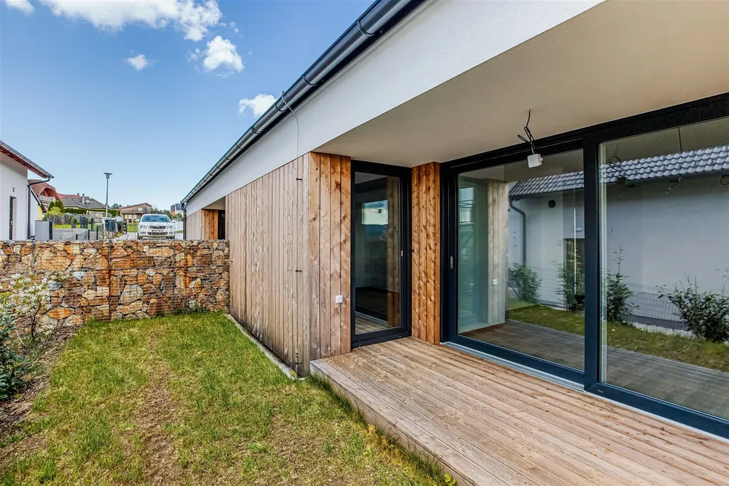 Apartmán je součástí jednopodlažní nepodsklepené dřevostavby se sedlovou střechou a třemi bytovými jednotkami. Objekt je zateplený tepelnou izolací a fasádním polystyrenem dle norem ČSN a minerální omítkou v kombinaci se Sibiřském modřínem. Kolaudace leden 2023. Vytápění bytu je řešeno vlastním elektrokotlem PROTHERM 6 kW napojeným na podlahové vytápění, dále jsou provedeny veškeré rozvody pro případné vytápění tepelným čerpadlem. V obývacím pokoji je připravený komín na napojení krbových kamen. K jednotce patří podíl na společných prostorech zahrady, která má plochu 571 m². K prodeji je také vedlejší jednotka "C".