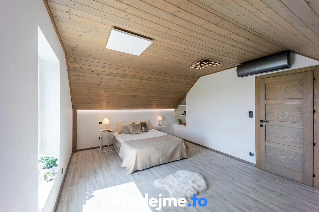 Dům s obytným podkrovím vás hned za předsíní přivítá velkým otevřeným prostorem obývacího pokoje s plně vybaveným kuchyňským koutem. Jedinečnou atmosféru místnosti tvoří nadstandardní prosvětlenost a přiznané stropní trámy. Z obývacího pokoje budete mít zároveň vstupy na zadní i přední terasu. V přízemí dále najdete technickou místnost a koupelnu se sprchovým koutem a toaletou. Obytné podkroví nabízí prostornou ložnici, dětský pokoj a pro větší pohodlí i samostatnou toaletu.
