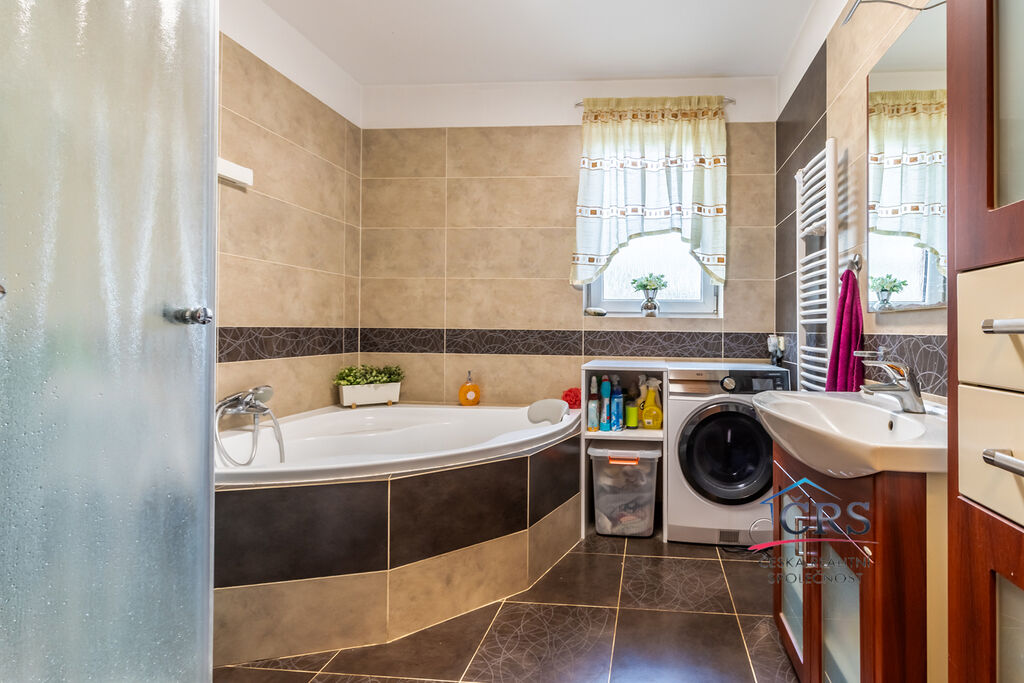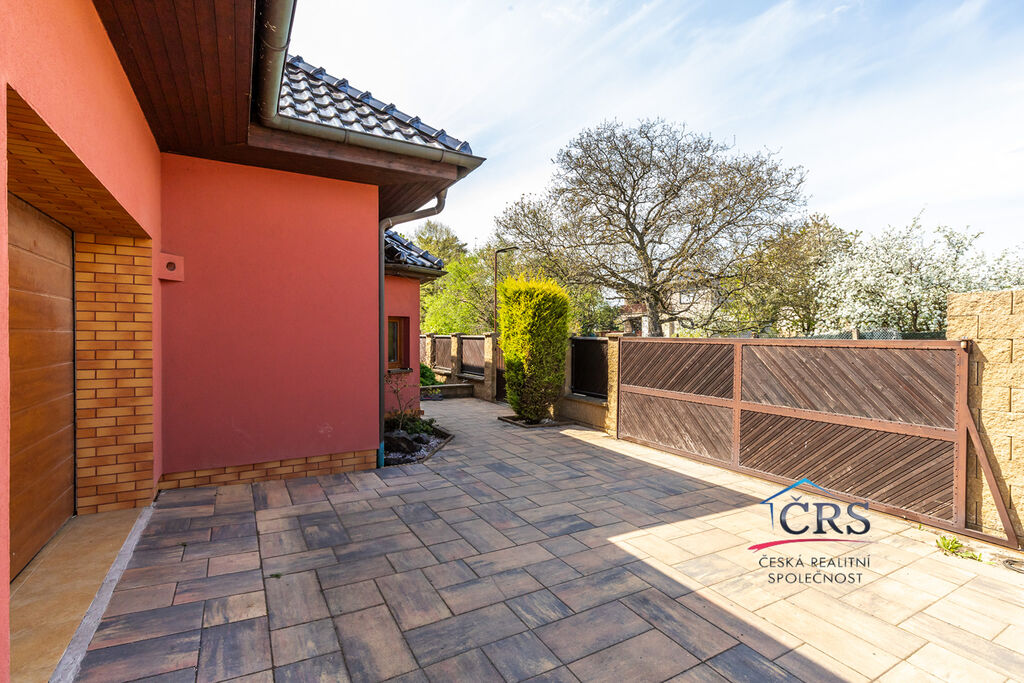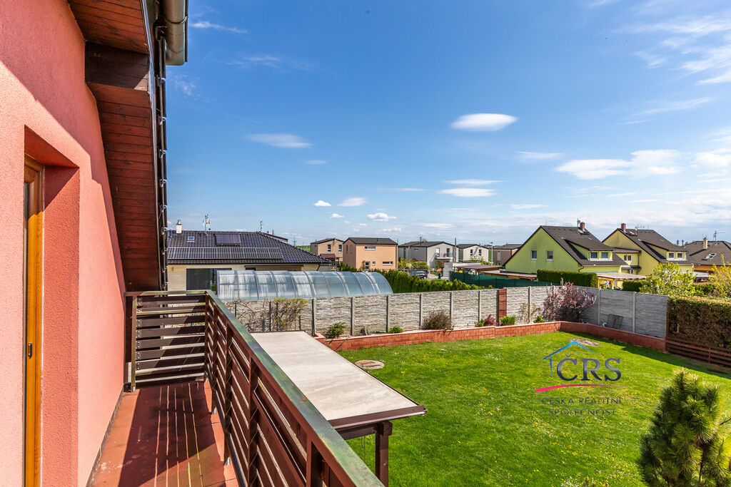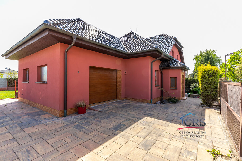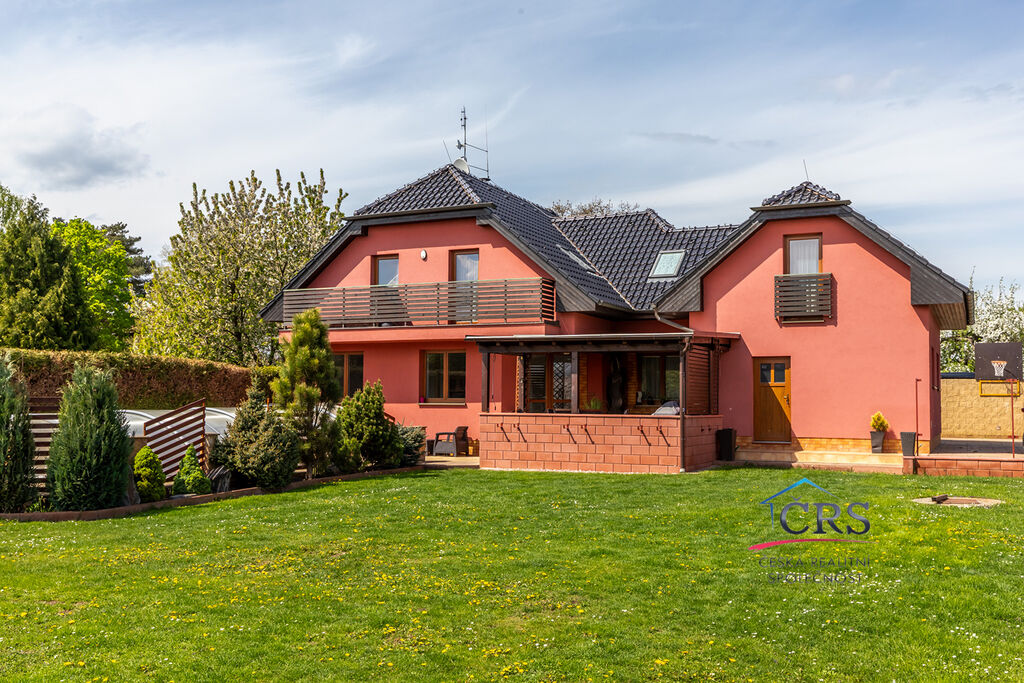Dvougenerační rodinný dům o celkové dispozici 8+1 ležící na pozemku o velikosti 840 m2, zastřešenou terasou 30 m2 bazénem a prostornou garáží. V přízemí se nachází prostorný obývací pokoj s východem na terasu, pracovna, koupelna, samostatná toaleta, garáž, chodba, zádveří, kuchyňská linka s vestavěnými spotřebiči ( sklokeramická deska, el. trouba, myčka, mikrovlnná trouba, digestoř, americká lednice ). V prvním patře jsou 3 ložnice, obývací pokoj, ložnice ( zde je příprava na kuchyňskou linku ), chodba, pracovna, koupelna s toaletou. Dům napojen na veškeré IS ( vodovod, plyn, elektřina, kanalizace, vlastní studna ), vytápění v domě řešeno plynový kotlem – v přízemí podlahové, v patře radiátory. Dům byl zkolaudován v roce 2008.