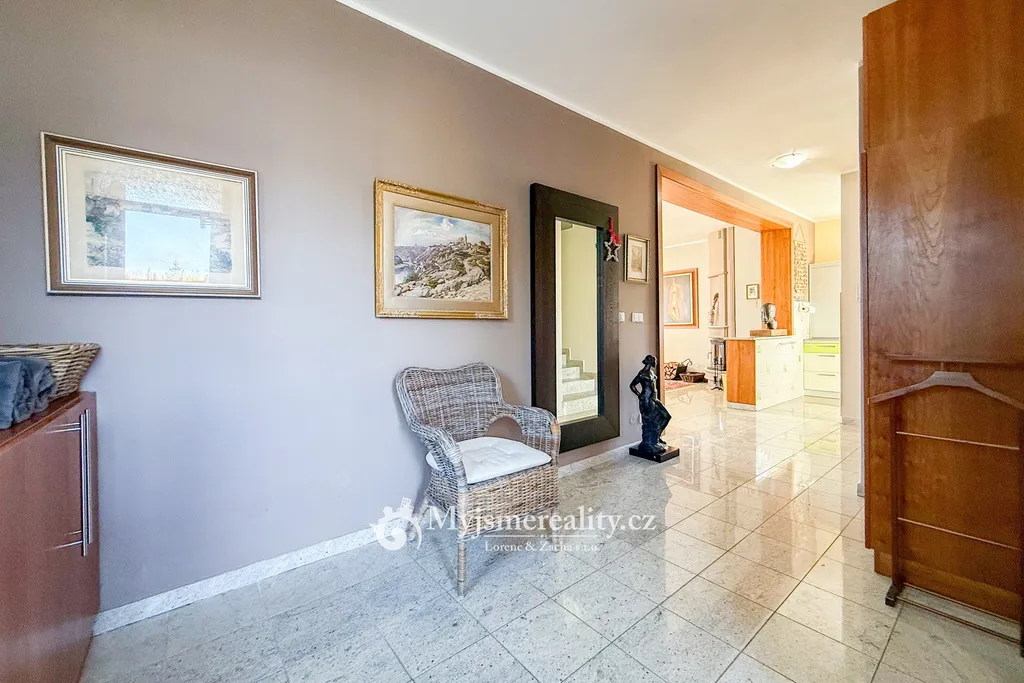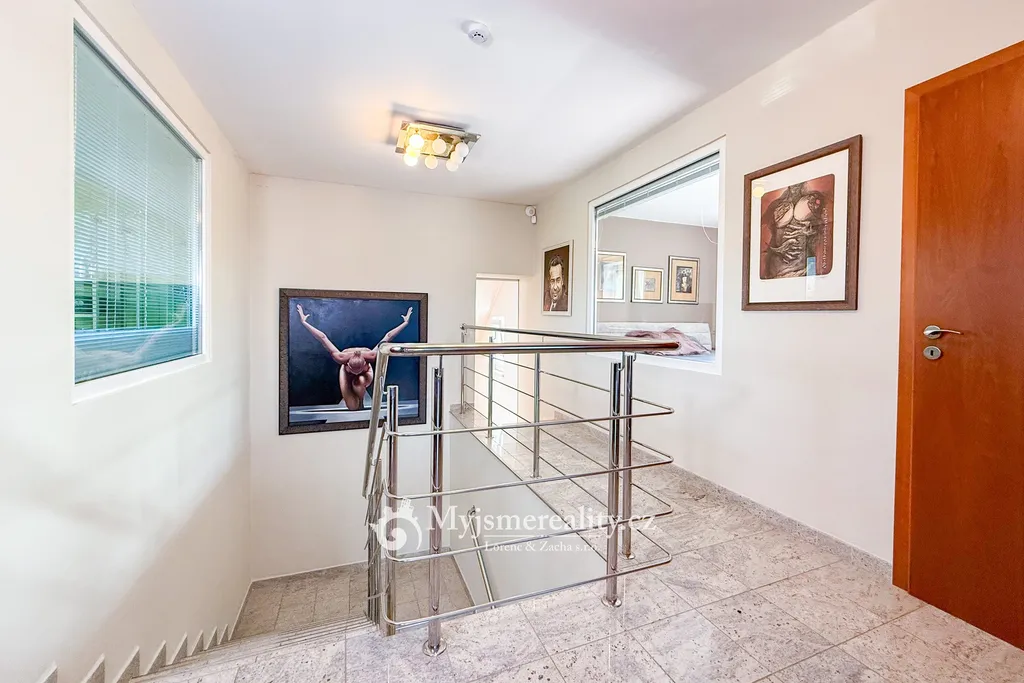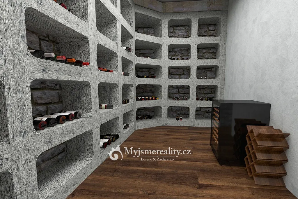V patře vás přivítá klidová část s třemi komfortními ložnicemi, elegantní koupelnou s vanou i sprchovým koutem a samostatnou šatnou. Suterén nabízí rozmanité možnosti využití – od wellness centra přes domácí fitness, vinný sklípek až po soukromý klub nebo ateliér.