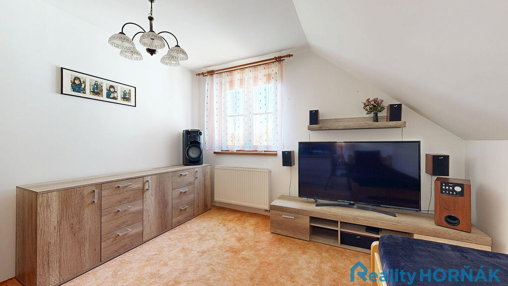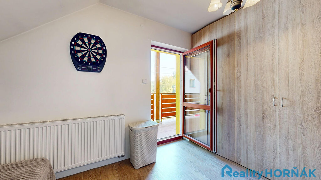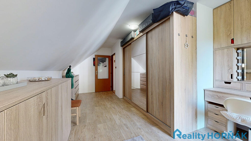 Po pohodlném schodišti vystoupáme do prvního patra rodinného domu s místnostmi: středové chodby (4,7 m2), dvou samostatných pokojů (15,1 m2 a 17,3 m2) s výstupem na krytý balkon – lodžii(13,3 m2), dalších dvou samostatných pokojů (13,3 a 12,01 m2). Ze středové chodby je přístupná samostatná místnost WC (2,65 m2) s klosetem, umyvadlem a místem pro pračku a sušičku (tuto místnost lze uzpůsobit jako druhou koupelnu.