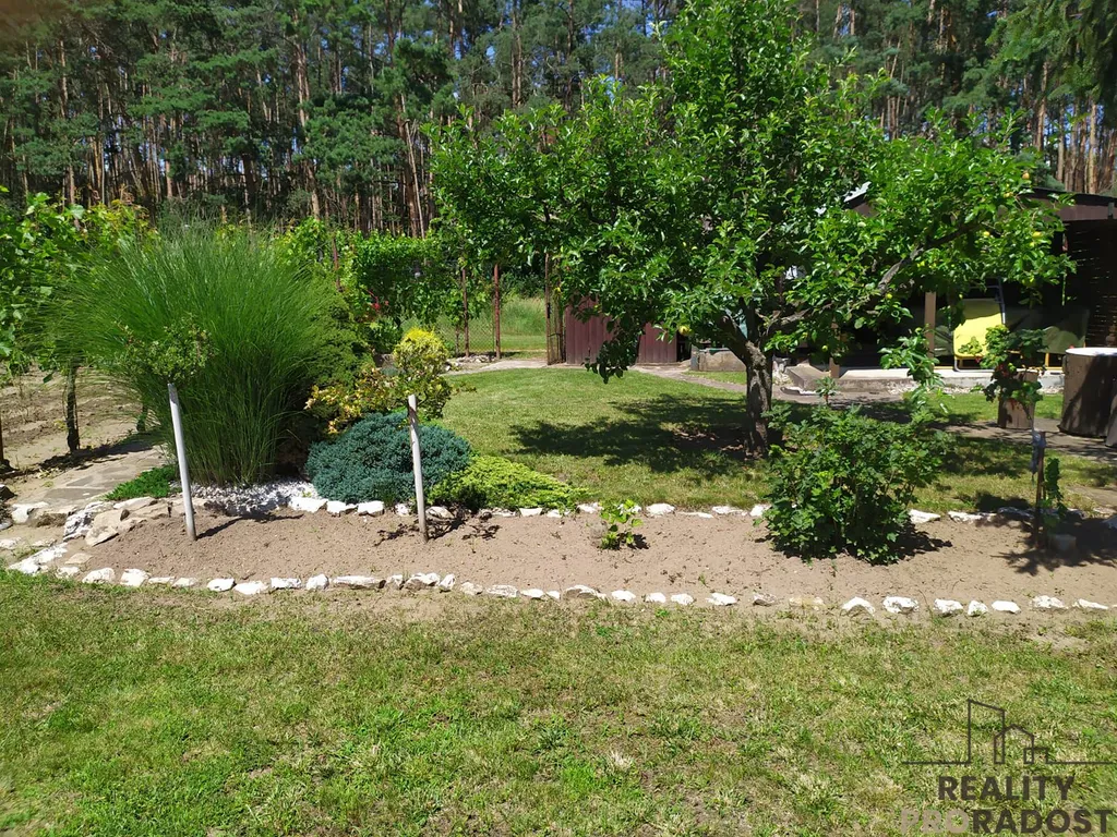 Součástí zahrady je dřevěná chata s terasou, která poskytuje příjemné posezení s výhledem do zeleně.