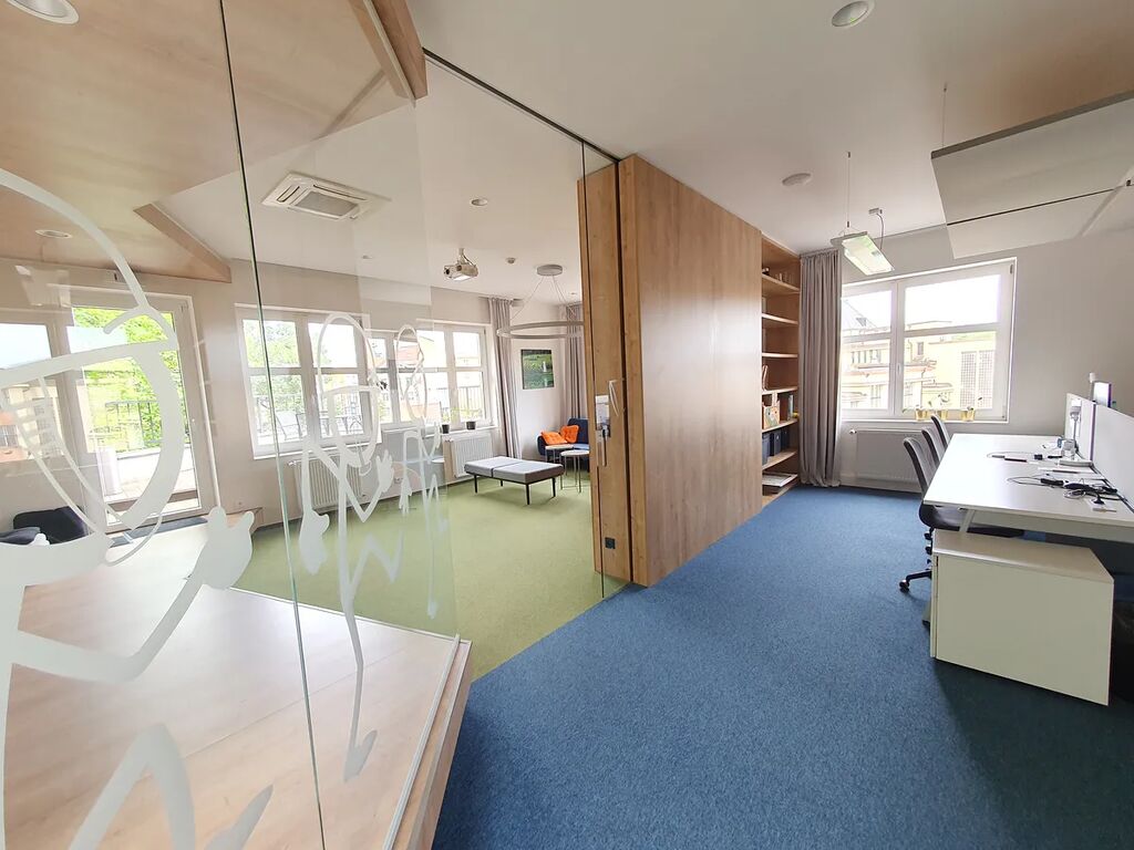 Vybavení by zůstalo - dřevěné zástěny, kuchyň, zasedačka včetně stolů a židlí a místo, relaxační místnost
