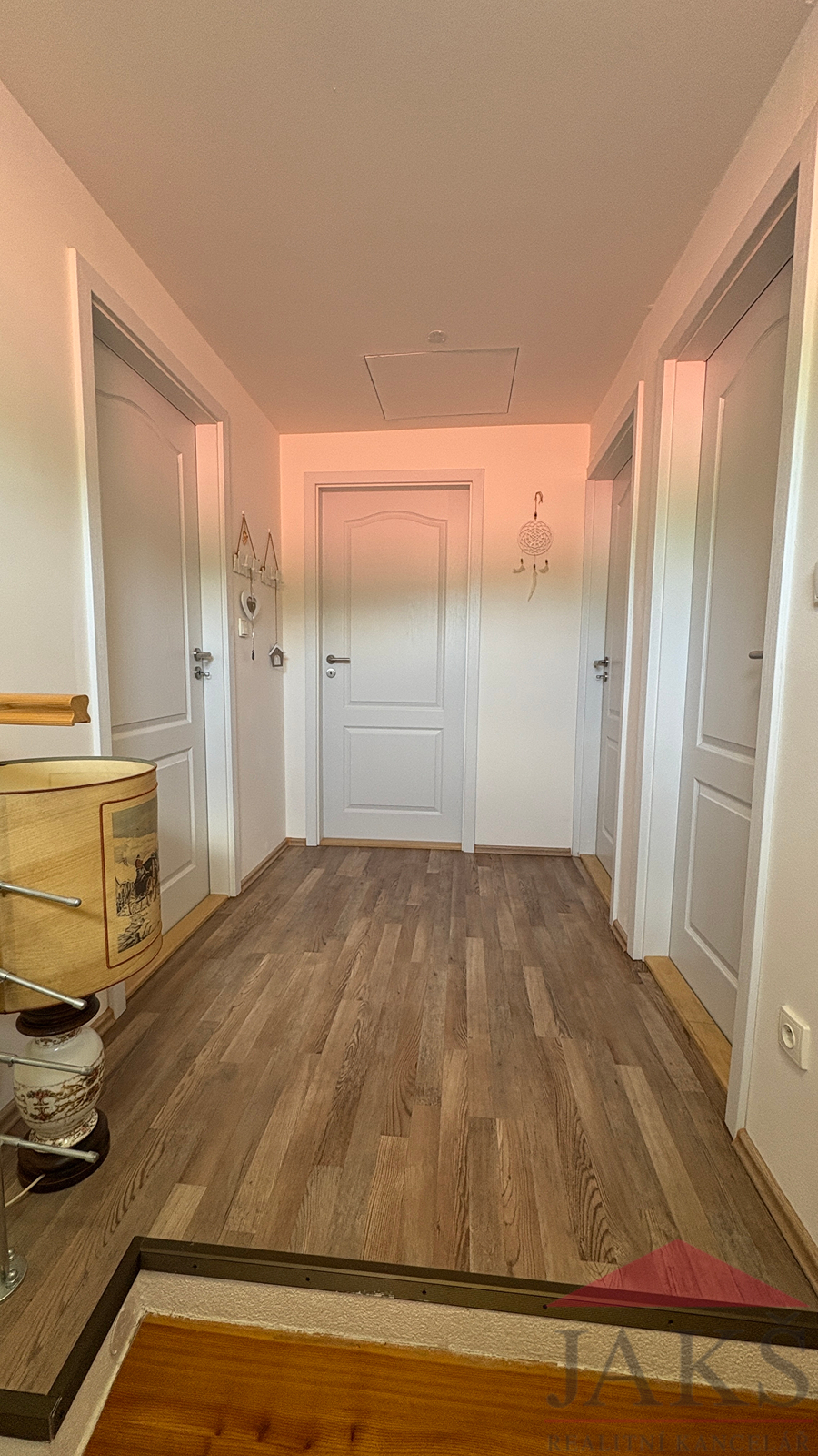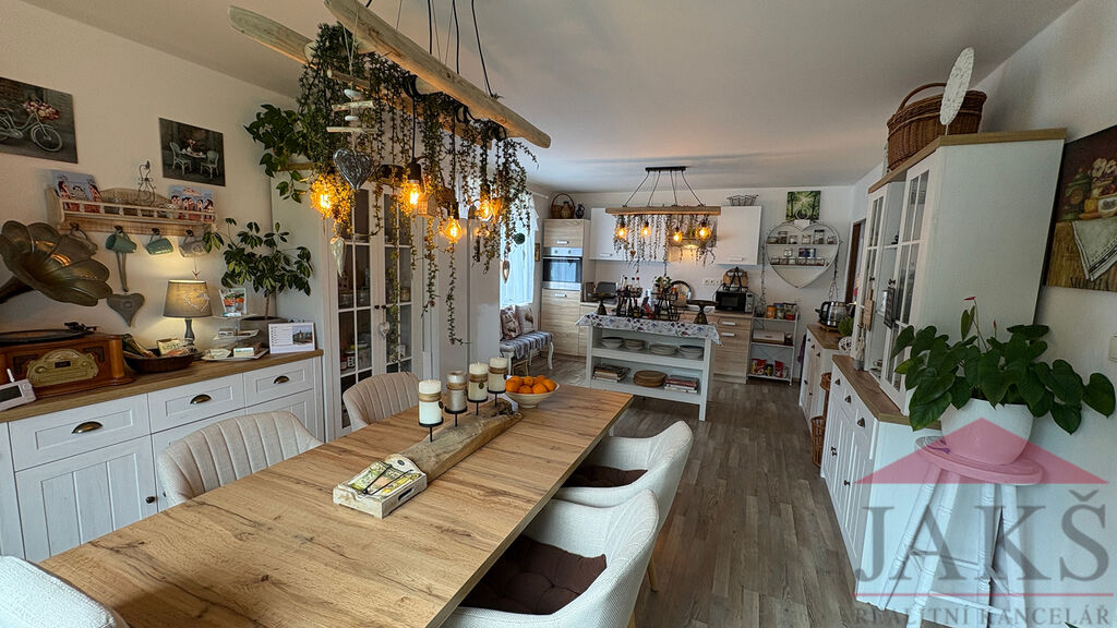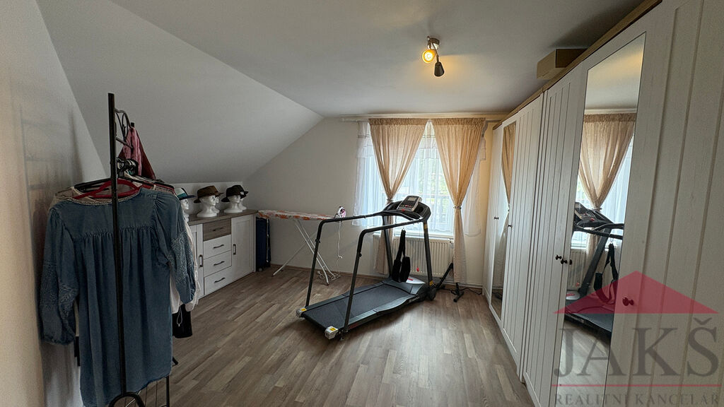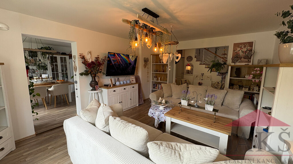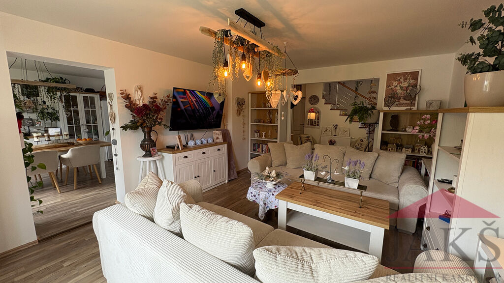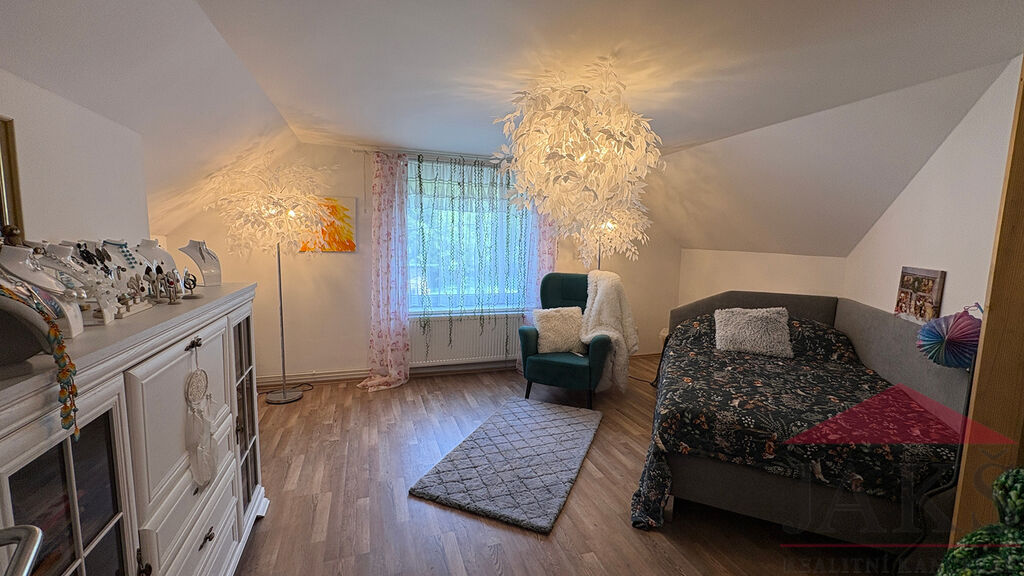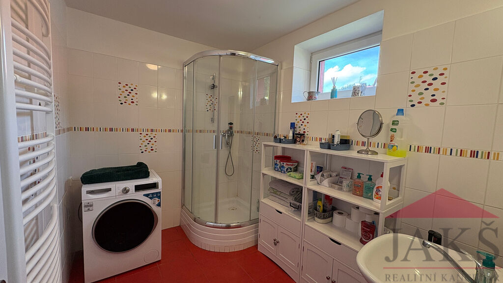 Popis: suterén (73,2 m2): dlouhá garáž (lze parkovat i dvě auta), technická místnost (el. boiler, elektrokotel, umyv.), 3x sklep/sklad, chodba se schodištěm do přízemí (72,8 m2): veranda, hala se schodištěm, samostatné WC (topný žebřík), koupelna (sprchový kout, umyv. se zrcadlem, vývody na pračku, topný žebřík), kuchyně s jídelnou (kuch linka vč. vestavěných spotřebičů: horkovzdušná trouba, sklo-ker. deska, digestoř a myčka) a prostorný obývací pokoj (možnost krbu); podkroví (73,2 m2): podesta, velká koupelna (rohová vana, umyv. se zrcadlem, WC, topný žebřík), 3x ložnice a balkon s výhledem do zeleně; půda. Možnost odkoupení veškerého bytového nábytku (užívaného pouze 1 rok) za cenu dohodou.