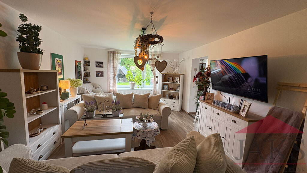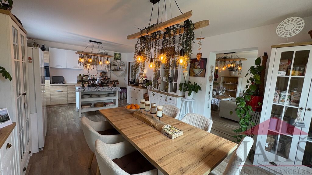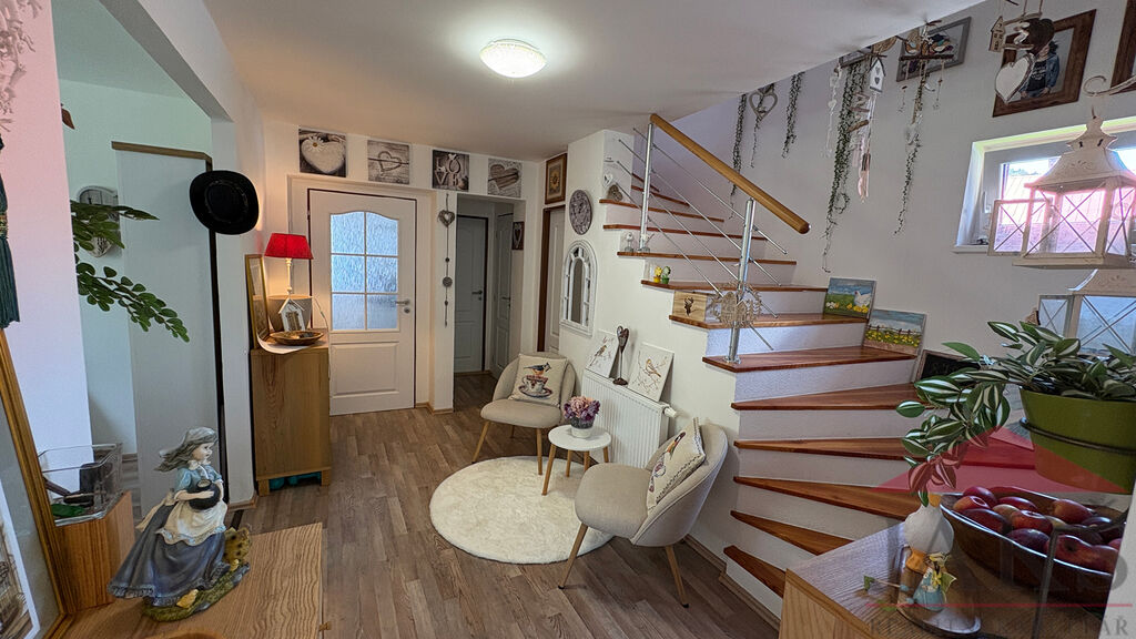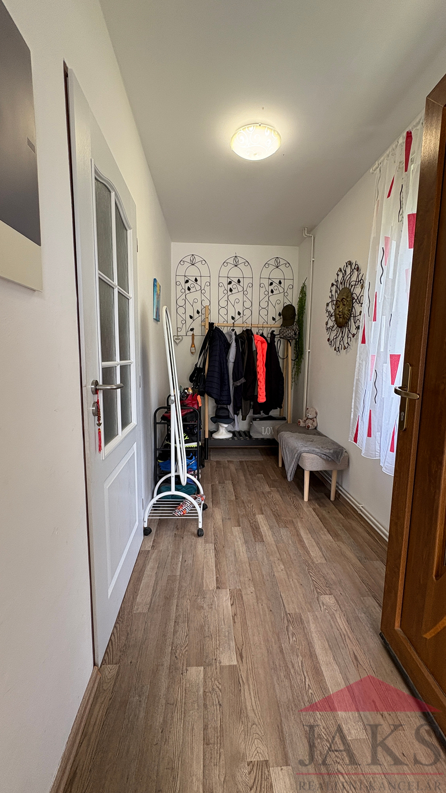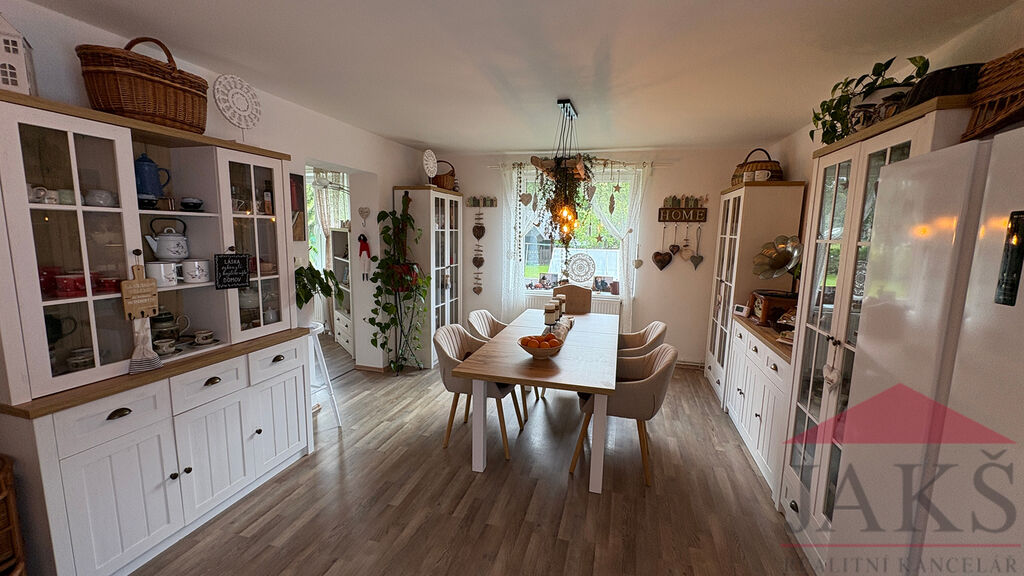 Popis: suterén (73,2 m2): dlouhá garáž (lze parkovat i dvě auta), technická místnost (el. boiler, elektrokotel, umyv.), 3x sklep/sklad, chodba se schodištěm do přízemí (72,8 m2): veranda, hala se schodištěm, samostatné WC (topný žebřík), koupelna (sprchový kout, umyv. se zrcadlem, vývody na pračku, topný žebřík), kuchyně s jídelnou (kuch linka vč. vestavěných spotřebičů: horkovzdušná trouba, sklo-ker. deska, digestoř a myčka) a prostorný obývací pokoj (možnost krbu); podkroví (73,2 m2): podesta, velká koupelna (rohová vana, umyv. se zrcadlem, WC, topný žebřík), 3x ložnice a balkon s výhledem do zeleně; půda. Možnost odkoupení veškerého bytového nábytku (užívaného pouze 1 rok) za cenu dohodou.