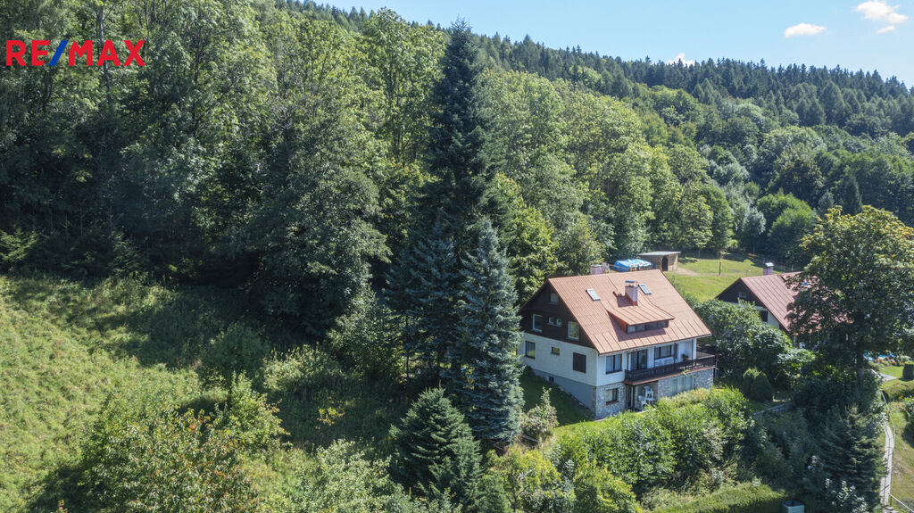 Dům je umístěn na pozemku o celkové výměře 1 302 m². Těsná blízkost lesa Vám zajistí naprosté soukromí. Z pozemku jsou navíc nádherné výhledy.