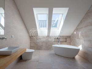 Třípodlažní dům s rozlohou 270 m2, který je charakteristický minimalistickým interiérem a velkými okny, nabízí v přízemí velkorysý obývací pokoj s jídelnou a kuchyň s ostrůvkem. Dále se zde nachází pokoj využitelný například pro relaxaci nebo jako pracovnu. Praktická je technická místnost s přípojkou na pračku a sušičku a toaleta. Z obývacího pokoje je přímý výstup na terasu. V prvním patře, do kterého se vstupuje z ulice, se nachází tři samostatné ložnice a velká koupelna s volně stojící vanou, sprchovým koutem a toaletou. Ve druhém patře jsou dva rozlehlé podkrovní pokoje a další koupelna s volně stojící vanou, sprchovým koutem a toaletou.