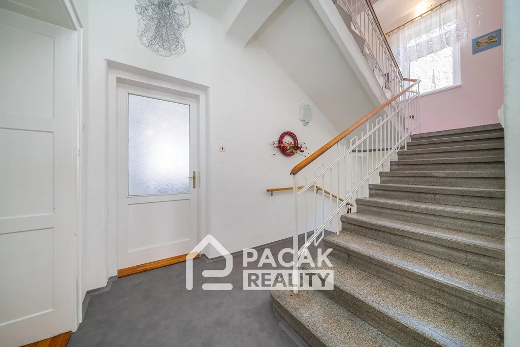 V přední části pozemku u veřejné komunikace se na rovinatém pozemku nachází hlavní stavba rodinného domu se zastavěnou plochou 254m2. Objekt je celý podsklepený, má 2 obytná podlaží se světlou výškou 330cm a půdou, vhodnou pro zbudování podkroví. Současná dispozice domu nabízí na každém patře samostatný velkometrážní byt. Historie spadá do roku 1933, kdy na přelomu tisíciletí byl rodinný dům adaptován do současné podoby. Byla vyměněna krytina na střeše, nové rozvody, omítky, podlahy, okna i fasáda. Stavba působí velice důstojným dojmem. Nabízí prostorné neprůchozí místnosti a široké chodby. Přístup k objektu ze dvou vjezdů i pro nákladní automobily.