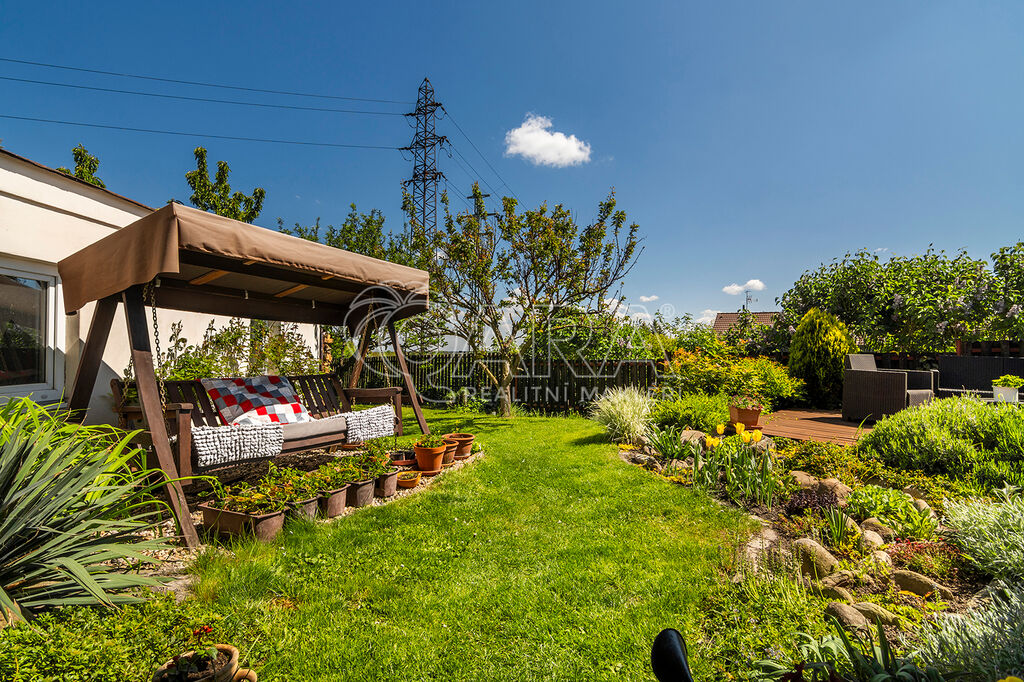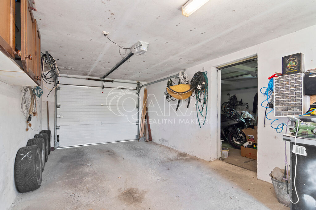 Součástí pozemku je prostorná dvougaráž (cca 40 m²), která je částečně podsklepená a tedy ideální např. k celoročnímu uskladnění potravin. Zahrada je zatravněná a osazená rostlinami a ovocnými stromy. Jsou zde umístěny kolny k uskladnění dřeva i zahradních a kutilských potřeb.