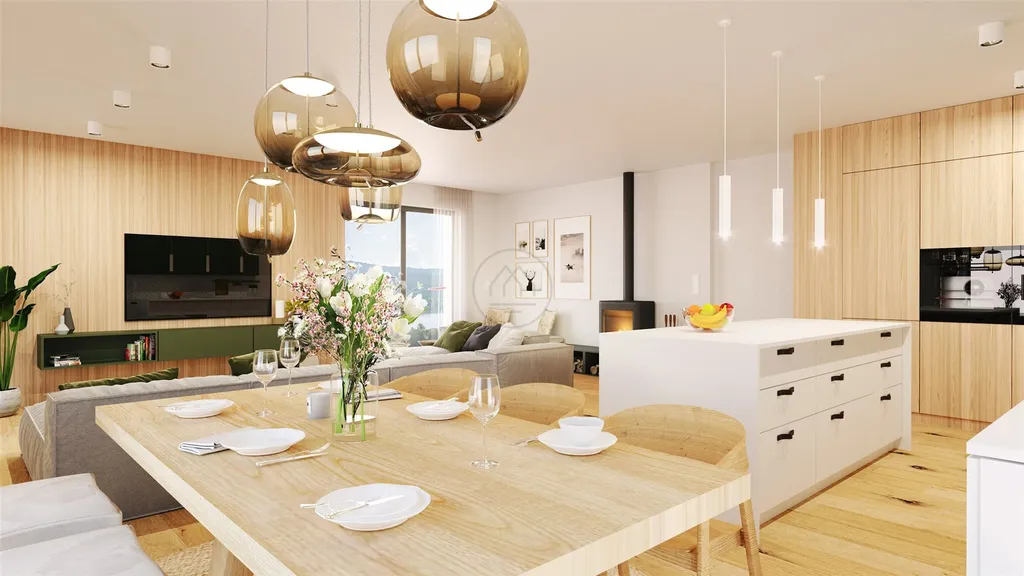 Objekt domu je navržen v souladu se šumavskou architekturou a důrazem na kvalitu stavebních materiálů. Přízemí disponuje prostorným zádveřím, ze kterého je přístupná koupelna s WC, technická místnost a pokoj pro hosty. Za schodištěm se nachází velká kuchyně s jídelnou, obývací částí, a vstupem na krásnou terasu s unikátním výhledem na vodní hladinu Lipna. V podkroví jsou dva pokoje, další koupelna s přípravou na saunu a hlavní ložnice se šatnou.