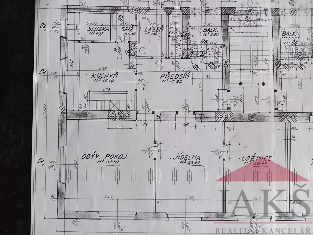 Popis: předsíň 17,55 m2, samostatné WC 2,31 m2, koupelna 5,13 m2 (vana, umyv. se zrcadlem, vývody na pračku, plynový kotel), bývalý balkon, nyní pracovna 5,33 m2 (šlo by obnovit po vybourání zdi anebo rozšířit do velké předsíně a přestavět na pokoj), kuchyň 17,58 m2 (kuch. linka s plynovým sporákem s el. troubou) s jídelnou, spíž 2,54 m2, komora 4,67 m2, prostorný obývací pokoj 29,97 m2 a 2x ložnice 23,31 m2 a 20,14 m2.