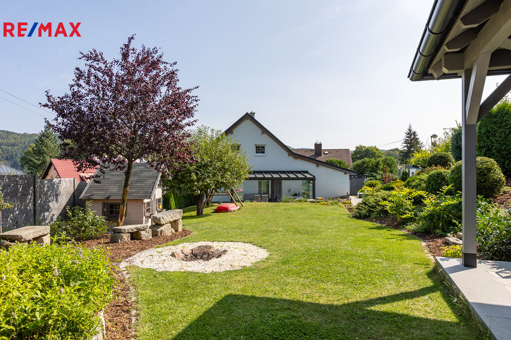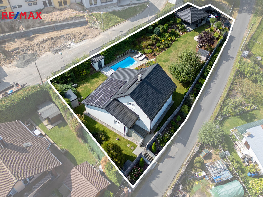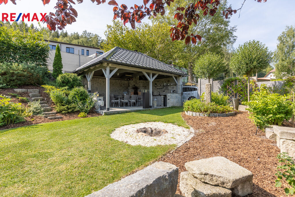 A teď to nejlepší – zahrada. Na ploše 725 m² najdete malý ráj. Pečlivě udržovaná, osázená okrasnými rostlinami a skalkami, jako stvořená pro letní večery i nedělní kávu. Velký krytý bazén nabídne osvěžení v horkých dnech, zatímco altán s letní kuchyní a kamenným krbem se stane středobodem každé oslavy. K tomu praktický zahradní domek na vše potřebné.