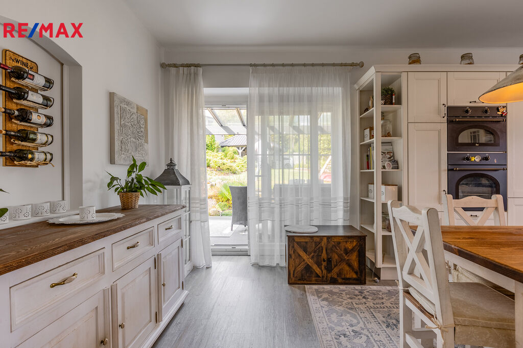 Dům je patrový a promyšleně rozdělený na dvě části. V přízemí se nachází prostorný a světlem zalitý obývací pokoj, propojený s moderní kuchyní vybavenou vestavěnými spotřebiči – radost tu vařit i trávit čas s rodinou. Z obýváku se plynule vstupuje do zimní zahrady, která poskytuje útočiště v každém ročním období. Dále zde najdete ložnici s vlastní šatnou, koupelnu, samostatné WC, útulnou předsíň i praktickou prádelnu.