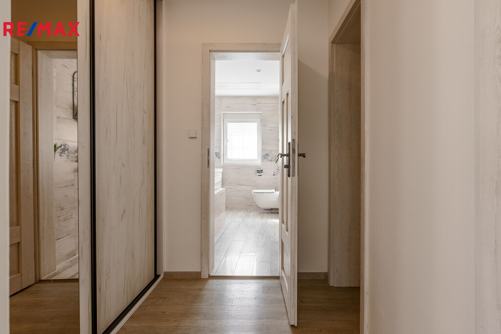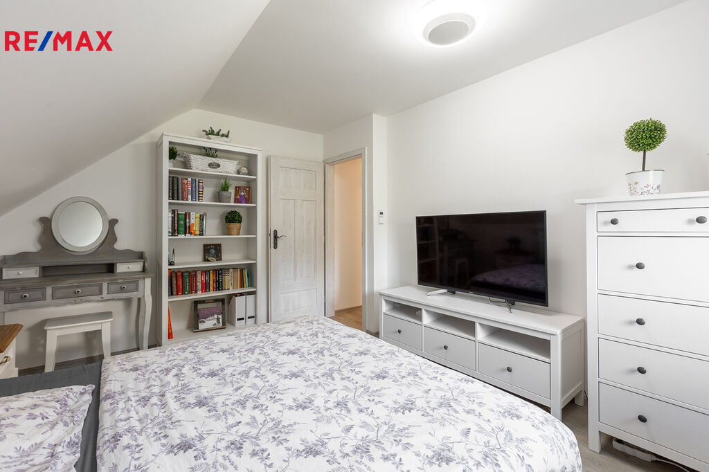 Horní patro nabízí další tři samostatné pokoje – ideální pro děti, pracovnu či pokoj pro hosty. Každý má své kouzlo a dostatek soukromí.