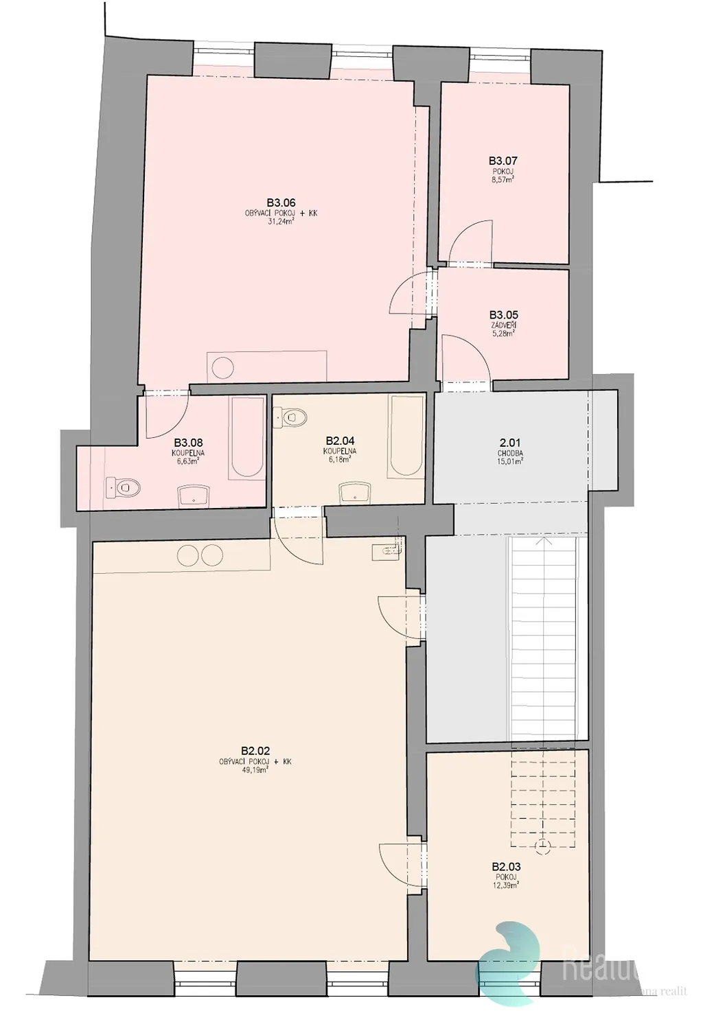 - V prvním patře jsou dva byty 2+kk (52 m2 a 67 m2) interiérově upravené přibližně před 15 lety. Elektřina i ostatní rozvody v těchto jednotkách jsou v původním stavu.