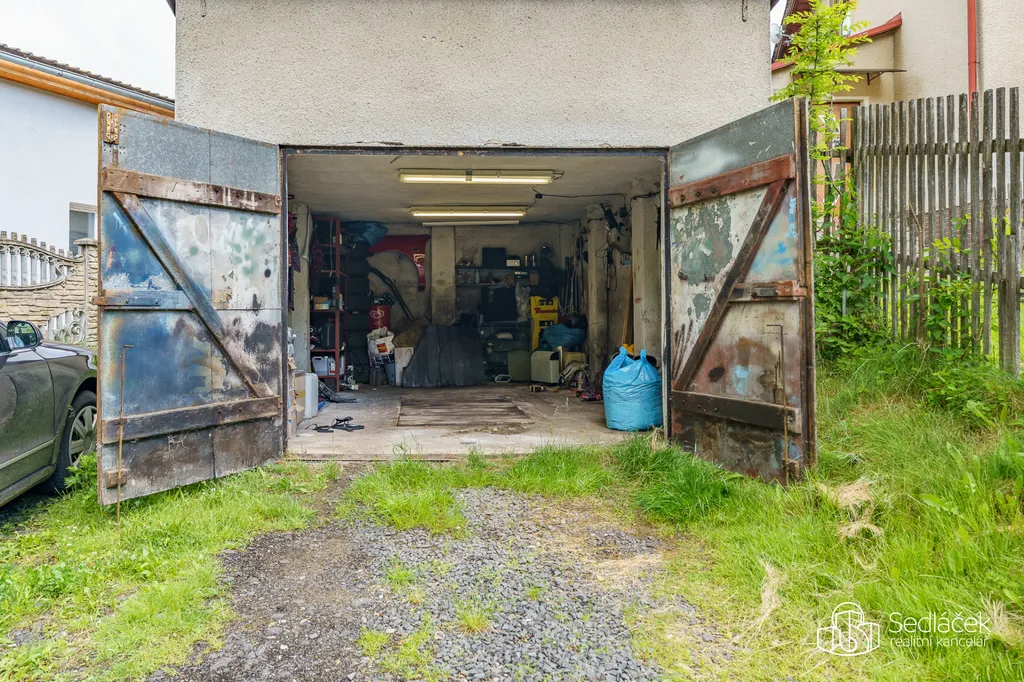 Na oploceném pozemku stojí samostatná garáž, dílna a sklad, takže o úložný prostor nebude nouze.