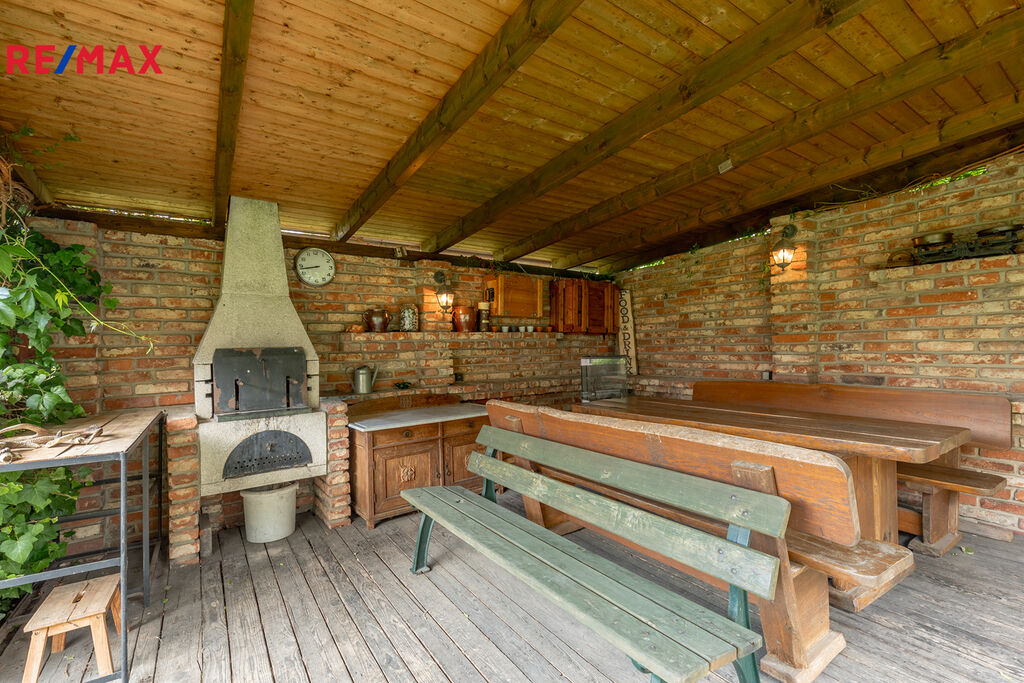 Vjezd na pozemek umožňuje elektrická brána s možností stání 2 vozů. Před domem je předzahrádka s květenou, která přináší více soukromí. Za domem je pak na jihozápad orientovaná zahrada o velikosti zhruba 200 m2, kde je mimo jiné skleník, kotec pro psy či pergola se zděným krbem, kde se můžete bavit s přáteli u dobrého jídla.