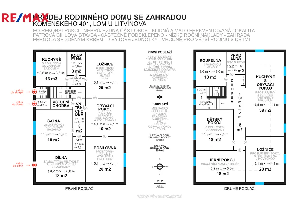 nabízíme Vám k prodeji prostorný patrový rodinný dům se zahradou ve velice klidné a minimálně frekventované části obce Lom, ve slepé ulici Komenského č. p. 401/6. Dům prošel kompletní vnitřní rekonstrukcí a byl od počátku zamýšlen pro bydlení větší rodiny, proto každé podlaží nabízí plnohodnotnou bytovou jednotku vybavenou koupelnou, kuchyní a dalšími pokoji. Samozřejmě je tento dům možné obývat jako celek, přičemž je k dispozici vícero pokojů, některé samostatné, další průchozí, jak je patrné na přiloženém půdorysu, kde jsou také upřesněny rozměry celého domu. Každé podlaží nabízí zhruba 135 m2 užitné plochy, tedy celkem spolu se sklepem 300 m2. Ve sklepě je krom úložného prostoru také umístěn automatický kombinovaný kotel, který lze také využívat pro ohřev vody namísto bojleru. Majitelé si tuto variantu vytápění velice chválí, náročnost s obsluhou minimální a roční nákladovost v podobě uhlí (lze i pelety nebo dřevo) se pohybuje do 60 m3 dle délky zimy. V přepočtu na peníze zhruba 3 tis měsíčně. Stávající hodnota PENB je ve třída „F“, která je zapříčiněna zejména chybějícím zateplením obvodových stěn. Při realizaci souboru opatření lze docílit hodnoty "B".