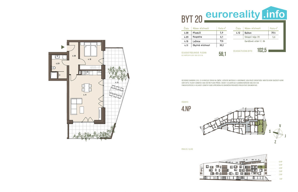 Celková užitná plocha bytu 58,1 m² a balkónu 39,4 m² zajišťuje pohodlné a prostorné bydlení. Se sklepní kójí o rozměru 5 m²