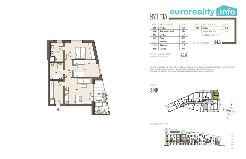 Celková užitná plocha bytu 78,4 m² a balkónu 11 m² zajišťuje pohodlné a prostorné bydlení. Se sklepní kójí o rozměru 5,2 m²