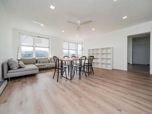V bytě jsou pak další dvě samostatné ložnice, koupelna se sprchovým koutem, vanou i toaletou, další samostatná toaleta, komora (kde jsou umístěny pračka se sušičkou) a velkorysý obývací prostor s kuchyňským koutem se vstupem na terasu i lodžii. Kuchyňská linka je vybavena vestavnými spotřebiči, na podlahách je neutrální velkoformátová dlažba a vinylová plovoucí podlaha, terasa je ohraničena drátěnými truhlíky, které skýtají možnosti výsadby okrasných keřů, příp. zahradničení, je na ní už i přípraven kovový rám pro zastřešenou pergolu. Na všech oknech jsou venkovní předokenní elektrické žaluzie, obývací prostor je navíc vybaven výkonným stylovým stropním ventilátorem.