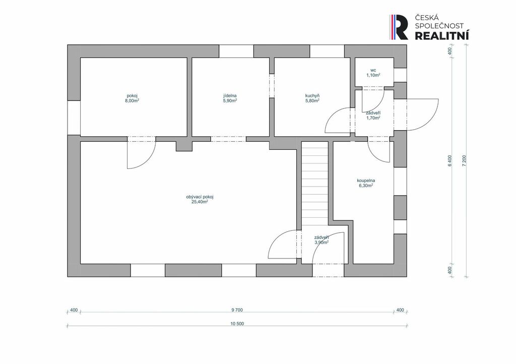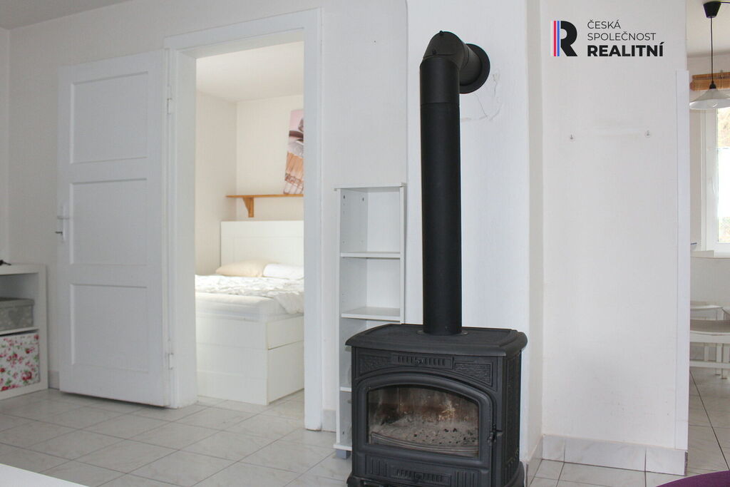 vstup do domu je řešen přes menší zádveří, ze kterého vstoupíte do hlavní obytné části, obývacího pokoje se vstupem do ložnice, menší jídelnou a kuchyňkou. Tato část disponuje podlahovým vytápěním a jsou zde i krbová kamna. V přízemí se nachází velká koupelna se sprchovým koutem a toaletou a při vstupu z chodbičky ještě jedna samostatná toaleta.