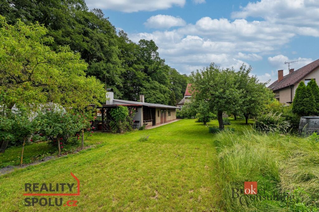 Zahrada uspokojí i domácí pěstitele zeleniny, či ovoce ze vzrostlých stromů, nebo menší chov zvířat, za garáží je k dispozici kurník na slepice