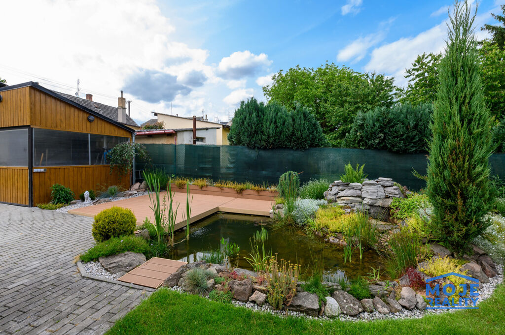 Na oplocené zahradě (202 m²) si užijete klidná rána s kávou i večerní grilování s přáteli. K dispozici je také zahradní domek s dílnou pro domácí kutily, kolna, přístřešek s venkovní kuchyní, menší koupací jezírko – vše v perfektním stavu a připravené k okamžitému využití.