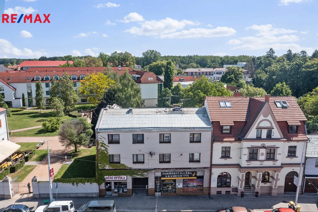 Jedná se o třípodlažní činžovní dům v srdci Lázní Bohdaneč, přímo u místní radnice, v atraktivní a klidné lokalitě s přímým vstupem do lázeňského parku vedle domu.