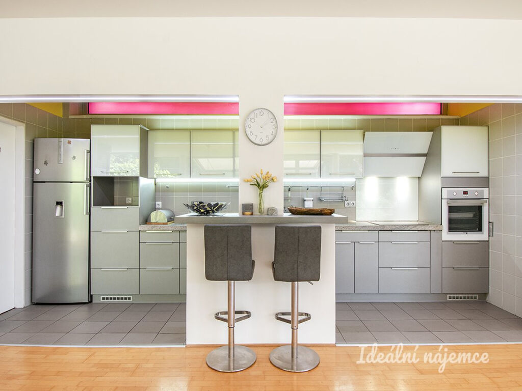 V kuchyni nalezneme vestavěné spotřebiče - ledničku, myčku nádobí, indukční varnou desku, elektrickou troubu a digestoř. Nabízí dostatek úložných prostor a samostatnou spižírnu.