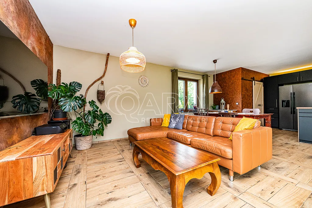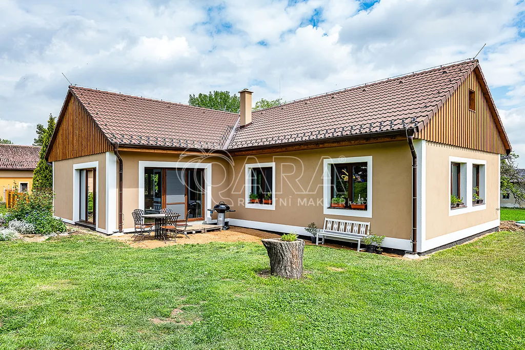 Dům z roku 2021 a má jedno podlaží do písmene L, kde najdete předsíň, technickou místnost, WC s bidetem, prostorný obývací pokoj, moderní kuchyni s ostrůvkem a spíží, koupelnu s vanou a sprchovým koutem, a tři samostatné pokoje.