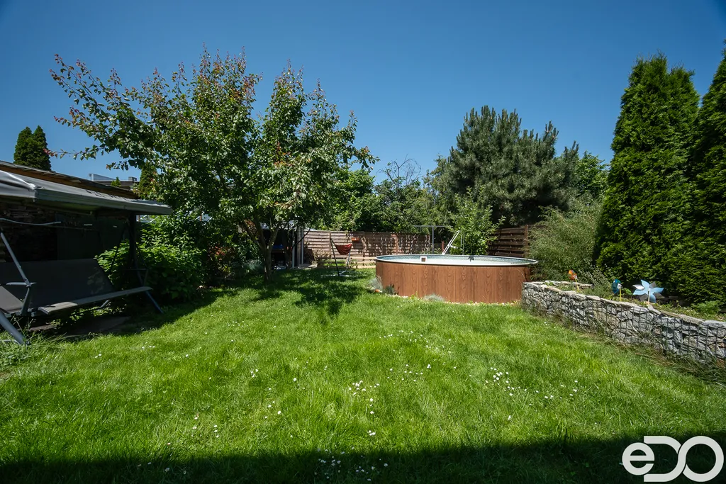 Zahrada je nenáročná na údržbu, přesto velmi příjemná – s posezením, meruňkou, švestkou a malým, pečlivě udržovaným políčkem se zeleninou.