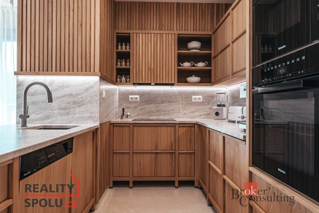 Byt je nabízen kompletně vybavený – stačí přijít s osobními věcmi a můžete začít nový život. Vybavení zahrnuje nábytek na míru z dubového masivu a špičkové spotřebiče značky Miele. O příjemné klima a zároveň záložní vytápění se stará klimatizační systém Siemens. Všechny použité materiály i řešení interiéru byly vybírány s důrazem na estetiku, funkčnost, nadčasovost a především kvalitu. Obklady a dlažby pocházejí od italského výrobce Mirage (série Royal), kuchyňské baterie s dřezem a filtrem na vodu dodala renomovaná značka Hansgrohe, osvětlení je z Itálie – Axolight Muse, pracovní kamenná deska Tachmahad a drobné spotřebiče značky Smeg. Zde opravdu není co vytknout.