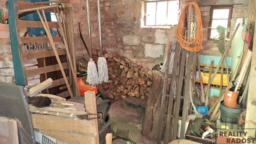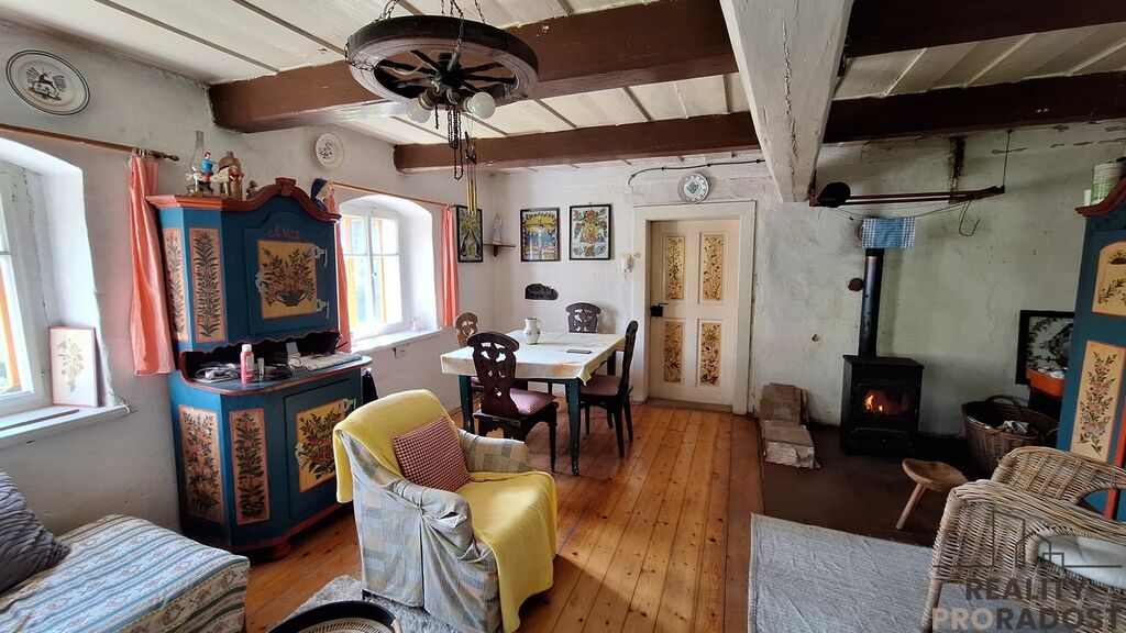 V přízemí se vchází do vstupní chodby, na jedné straně je obývací pokoj s krbovými kamny, dřevěnou podlahou a vkusně zařízeným nábytkem, na druhé straně je kuchyň. Z chodby je vstup na WC, a do technické místnosti pro skladování materiálu, dřeva, popřípadě je zde možnost využití malé dílny. Do koupelny je vstup z kuchyně, koupelna je vybavena sprchovým koutem, ohřev teplé vody je zajištěn elektrickým bojlerem. V koupelně je instalována klimatizace, která zajistí tepelnou pohodu v koupelně i v kuchyni současně. V horní části chaty je obytné podkroví, využívané pro spaní. Velkou předností je zahrada o ploše 898 m² plus lesní pozemek, kde jsou skalní sklepy a převisy. Pozemek je samostatný a poskytuje dostatek soukromí a klidu. Elektroinstalace je po rekonstrukci v mědi, vodoinstalace je již v plastu a odvod odpadní vody je do zrekonstruovaného septiku. Zdroj pitné vody je na pozemku pramenitou vodou zavedenou do domu.